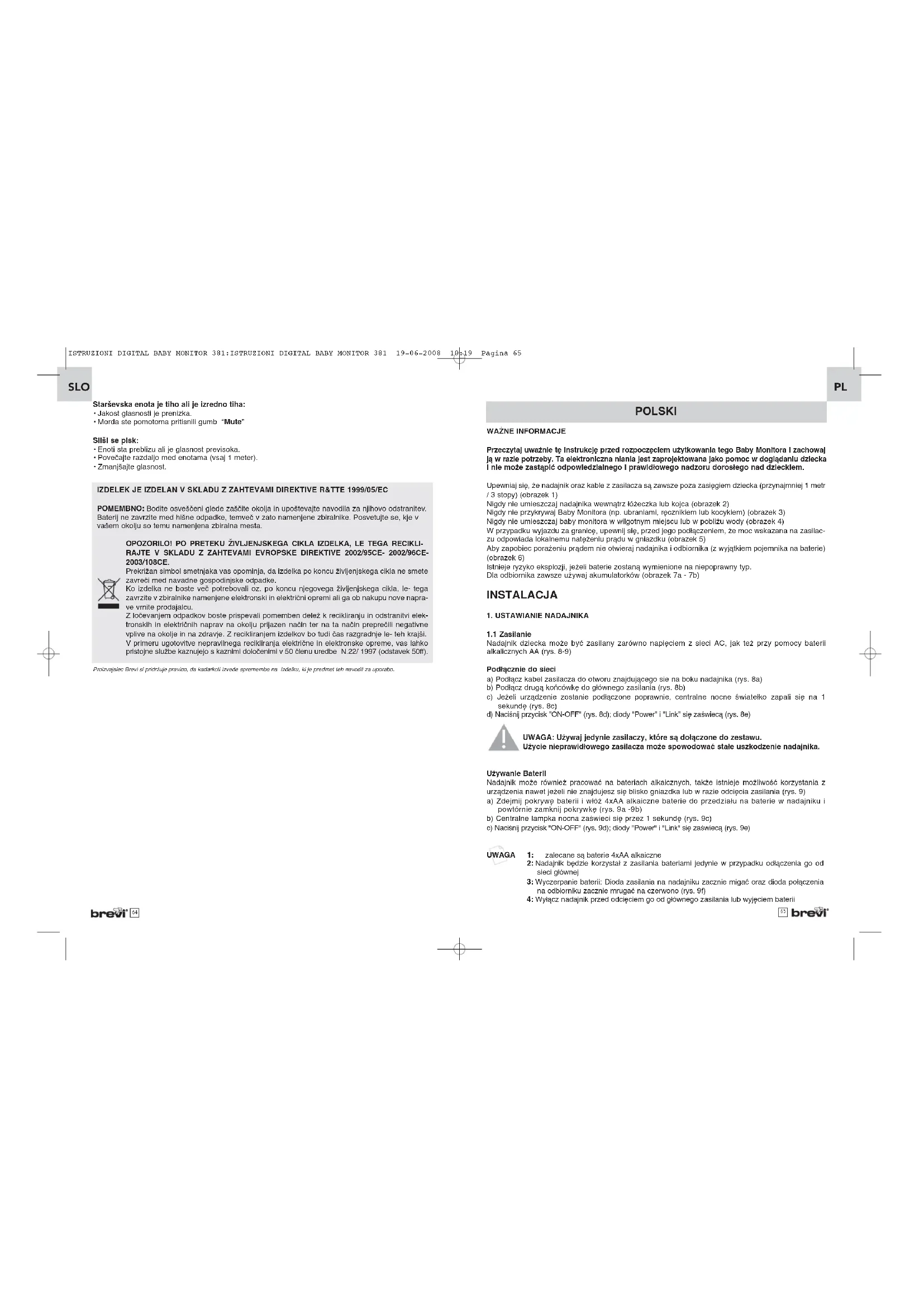 UWAGA! Baterie nie moga byc ladowane. Baterie lub akumulatorki musza byc ustawione zgodnie z polaryzacja. Do not mix new and used batteries or rechargeable batteries. Nie laczyc nowych baterii z uzywanymi. Nie laczyc baterii roznych typow. Uzywaj oddzielnie wylacznie baterii lub wylacznie akumulatorkow, zalecanego i podobnego typu.Usun zuzyte baterie lub akumulatorki z produktu. Nie zwieraj koncowek baterii. Brevi zastrzega sobie prawo wprowadzenia zmian bez uprzedniego poinformowania. Akumulatorki musza byc usuniete z produktu przed ladowaniem zawsze kiedy jest to możliwe. Akumulatorki powinny byc wymieniane zawsze pod nadzorem osoby doroslej UWAGA! Zwykle alkaiczne baterie nie powinny byc uzywane zamiast akumulatorkow. Akumulatorki powinny byc ustawiane zgodnie z ich polaryzacja. Nie lacz nowych oraz zuzytych akumulatorkow. Nie mieszaj roznych rodzajow akumulatorkow. Uzywaj jedynie akumulatorkow zalecanego i podobnego typu. Nie zwieraj ze soba koncowek baterii. Akumulatorki powinny byc wymieniane pod nadzorem doroslych. ISTRUZIONI DIGITAL BABY MONITOR 381:ISTRUZIONI DIGITAL BABY MONITOR 381 19-06-2008 10:19 Pagina 67URZĄDZENIE JEST ZGODNE Z PODSTAWOWYMI WYMOGAMI ORAZ ODPOWIEDNIMI
