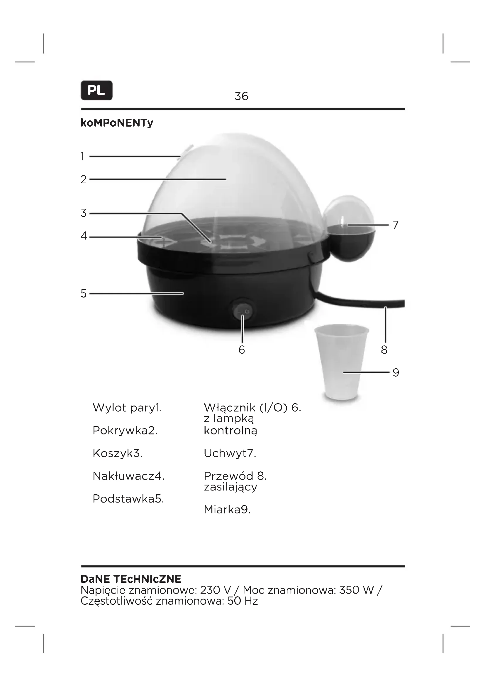 Napięcie znamionowe: 230 V / Moc znamionowa: 350 W / Częstotliwość znamionowa: 50 Hz DaNE TEcHNIcZNE Włącznik (I/O) 6. z lampką kontrolną Uchwyt7. Przewód 8. zasilający Miarka9.36