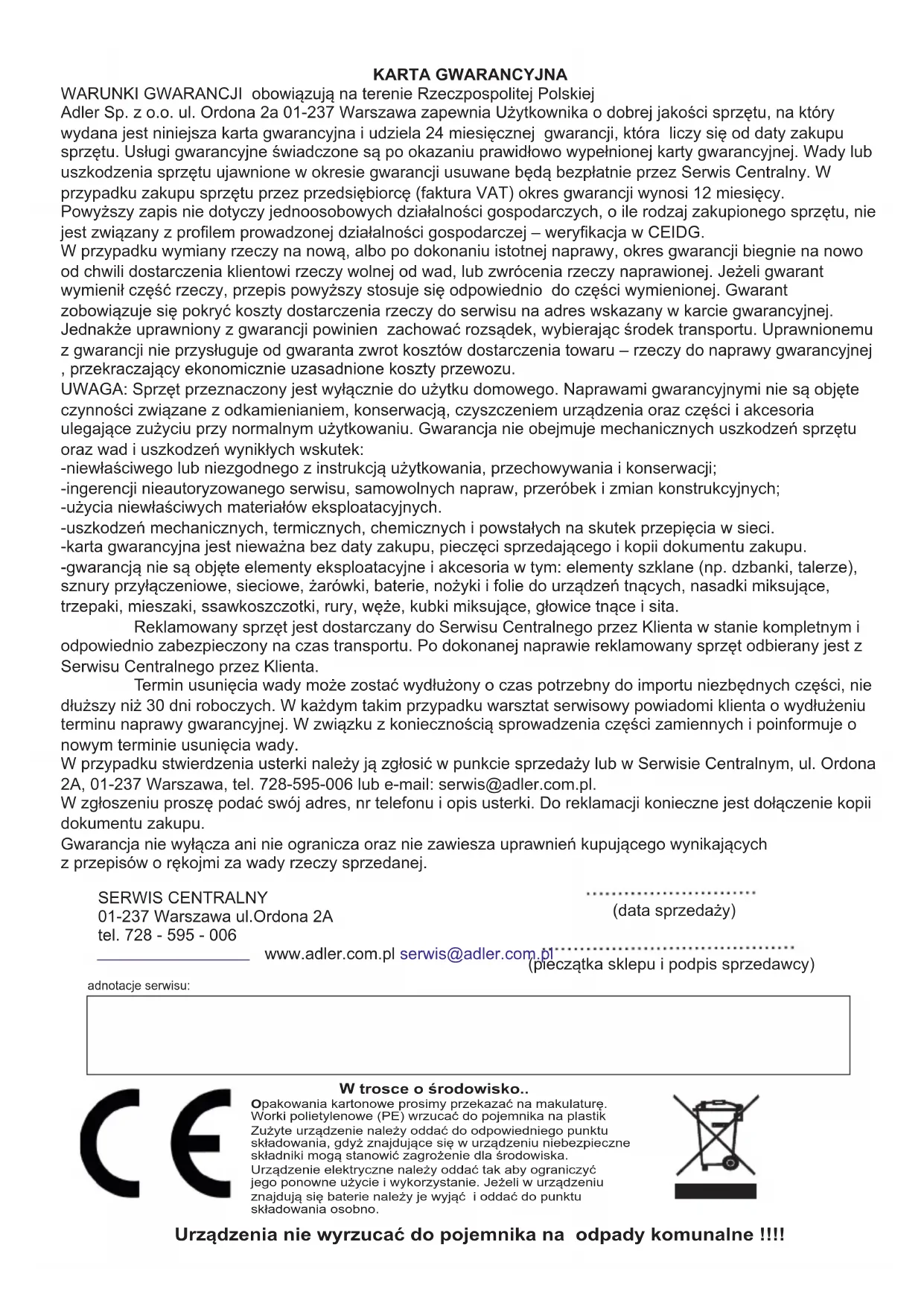 ﯾﺪﮭﺗ تﺎﻧﻮﻜﻤﻟا ﻞﻜﺸﺗ ﺪﻗ زﺎﮭﺠﻟا ﻲﻓ تﺎﯾرﺎﻄﺑ كﺎﻨھ نﺎﻛ اذإ .ﺎﮭﻣاﺪﺨﺘﺳاو ﺎﮭﻣاﺪﺨﺘﺳا ةدﺎﻋإ ،.ﻞﺼﻔﻨﻣ ﻞﻜﺸﺑ ﺔﻧﺰﺨﻤﻟا ﺔﻄﻘﻨﻟا ﻰﻟإ ﺎﮭﺋﺎﻄﻋإو ﺎﮭﺟاﺮﺧإ ﻚﯿﻠﻌﻓ33 KARTA GWARANCYJNA WARUNKI GWARANCJI obowiązują na terenie Rzeczpospolitej Polskiej Adler Sp. z o.o. ul. Ordona 2a 01-237 Warszawa zapewnia Użytkownika o dobrej jakości sprzętu, na który wydana jest niniejsza karta gwarancyjna i udziela 24 miesięcznej gwarancji, która liczy się od daty zakupu sprzętu. Usługi gwarancyjne świadczone są po okazaniu prawidłowo wypełnionej karty gwarancyjnej. Wady lub uszkodzenia sprzętu ujawnione w okresie gwarancji usuwane będą bezpłatnie przez Serwis Centralny. W przypadku zakupu sprzętu przez przedsiębiorcę (faktura VAT) okres gwarancji wynosi 12 miesięcy. Powyższy zapis nie dotyczy jednoosobowych działalności gospodarczych, o ile rodzaj zakupionego sprzętu, nie jest związany z profilem prowadzonej działalności gospodarczej – weryfikacja w CEIDG. W przypadku wymiany rzeczy na nową, albo po dokonaniu istotnej naprawy, okres gwarancji biegnie na nowo od chwili dostarczenia klientowi rzeczy wolnej od wad, lub zwrócenia rzeczy naprawionej. Jeżeli gwarant wymienił część rzeczy, przepis powyższy stosuje się odpowiednio do części wymienionej. Gwarant zobowiązuje się pokryć koszty dostarczenia rzeczy do serwisu na adres wskazany w karcie gwarancyjnej. Jednakże uprawniony z gwarancji powinien zachować rozsądek, wybierając środek transportu. Uprawnionemu z gwarancji nie przysługuje od gwaranta zwrot kosztów dostarczenia towaru – rzeczy do naprawy gwarancyjnej , przekraczający ekonomicznie uzasadnione koszty przewozu. UWAGA: Sprzęt przeznaczony jest wyłącznie do użytku domowego. Naprawami gwarancyjnymi nie są objęte czynności związane z odkamienianiem, konserwacją, czyszczeniem urządzenia oraz części i akcesoria ulegające zużyciu przy normalnym użytkowaniu. Gwarancja nie obejmuje mechanicznych uszkodzeń sprzętu oraz wad i uszkodzeń wynikłych wskutek: -niewłaściwego lub niezgodnego z instrukcją użytkowania, przechowywania i konserwacji; -ingerencji nieautoryzowanego serwisu, samowolnych napraw, przeróbek i zmian konstrukcyjnych; -użycia niewłaściwych materiałów eksploatacyjnych. -uszkodzeń mechanicznych, termicznych, chemicznych i powstałych na skutek przepięcia w sieci. -karta gwarancyjna jest nieważna bez daty zakupu, pieczęci sprzedającego i kopii dokumentu zakupu. -gwarancją nie są objęte elementy eksploatacyjne i akcesoria w tym: elementy szklane (np. dzbanki, talerze), sznury przyłączeniowe, sieciowe, żarówki, baterie, nożyki i folie do urządzeń tnących, nasadki miksujące, trzepaki, mieszaki, ssawkoszczotki, rury, węże, kubki miksujące, głowice tnące i sita. Reklamowany sprzęt jest dostarczany do Serwisu Centralnego przez Klienta w stanie kompletnym i odpowiednio zabezpieczony na czas transportu. Po dokonanej naprawie reklamowany sprzęt odbierany jest z Serwisu Centralnego przez Klienta. Termin usunięcia wady może zostać wydłużony o czas potrzebny do importu niezbędnych części, nie dłuższy niż 30 dni roboczych. W każdym takim przypadku warsztat serwisowy powiadomi klienta o wydłużeniu terminu naprawy gwarancyjnej. W związku z koniecznością sprowadzenia części zamiennych i poinformuje o nowym terminie usunięcia wady. W przypadku stwierdzenia usterki należy ją zgłosić w punkcie sprzedaży lub w Serwisie Centralnym, ul. Ordona 2A, 01-237 Warszawa, tel. 728-595-006 lub e-mail: serwis@adler.com.pl. W zgłoszeniu proszę podać swój adres, nr telefonu i opis usterki. Do reklamacji konieczne jest dołączenie kopii dokumentu zakupu. Gwarancja nie wyłącza ani nie ogranicza oraz nie zawiesza uprawnień kupującego wynikających z przepisów o rękojmi za wady rzeczy sprzedanej. SERWIS CENTRALNY 01-237 Warszawa ul.Ordona 2A tel. 728 - 595 - 006 www.adler.com.pl serwis@adler.com.pl (data sprzedaży) (pieczątka sklepu i podpis sprzedawcy) adnotacje serwisu: W trosce o środowisko.. Opakowania kartonowe prosimy przekazać na makulaturę.Worki polietylenowe (PE) wrzucać do pojemnika na plastikZużyte urządzenie należy oddać do odpowiedniego punktu składowania, gdyż znajdujące się w urządzeniu niebezpieczne składniki mogą stanowić zagrożenie dla środowiska. Urządzenie elektryczne należy oddać tak aby ograniczyćjego ponowne użycie i wykorzystanie. Jeżeli w urządzeniuznajdują się baterie należy je wyjąć i oddać do punktu składowania osobno. Urządzenia nie wyrzucać do pojemnika na odpady komunalne !!!!34