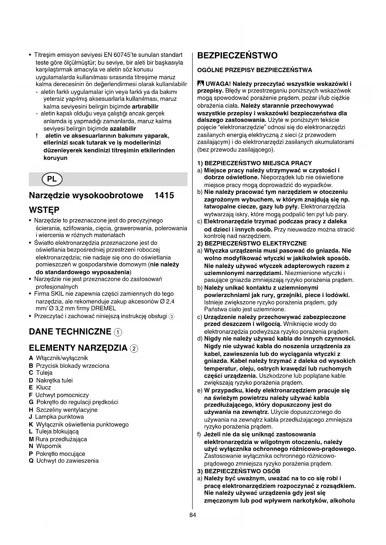- Przeczytać i zachować niniejszą instrukcję obsługi 3 DANE TECHNICZNE 1 ELEMENTYNARZĘDZIA2 A Włącznik/wyłącznik B Przycisk blokady wrzeciona C Tuleja D Nakrętka tulei E Klucz F Uchwyt pomocniczy G Pokrętło do regulacji prędkości H Szczeliny wentylacyjne J Lampka punktowa K Wyłącznik oświetlenia punktowego L Tuleja blokującą M Rura przedłużająca N Wspornik P Pokrętło mocujące Q Uchwyt do zawieszenia BEZPIECZEŃSTWO