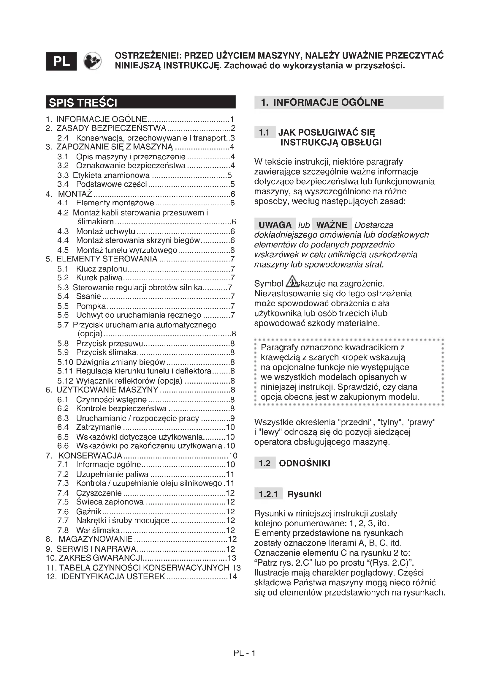 Niniejsza instrukcja zawiera wszelkie informacje niezbędne do posługiwania się maszyną i poprawnego wykonania podstawowych czynności z zakresu konserwacji dokonywanych przez samego użytkownika. Wszystkie czynności regulacyjne i konserwacyjne nieopisane w niniejszej instrukcji powinny byćPL - 13 wykonane przez Państwa sprzedawcę lub w autoryzowanym punkcie serwisowym, które dysponuje wiedzą i sprzętem umożliwiającym właściwe wykonanie czynności konserwacyjnych przy zapewnieniu odpowiedniego stopnia bezpieczeństwa maszyny. Czynności wykonane przez nieodpowiednie serwisy lub osoby niekompetentne powodują utratę wszystkich praw konsumenta udzielonych gwarancji oraz zwalniają producenta z jakichkolwiek zobowiązań i z odpowiedzialności prawnej.