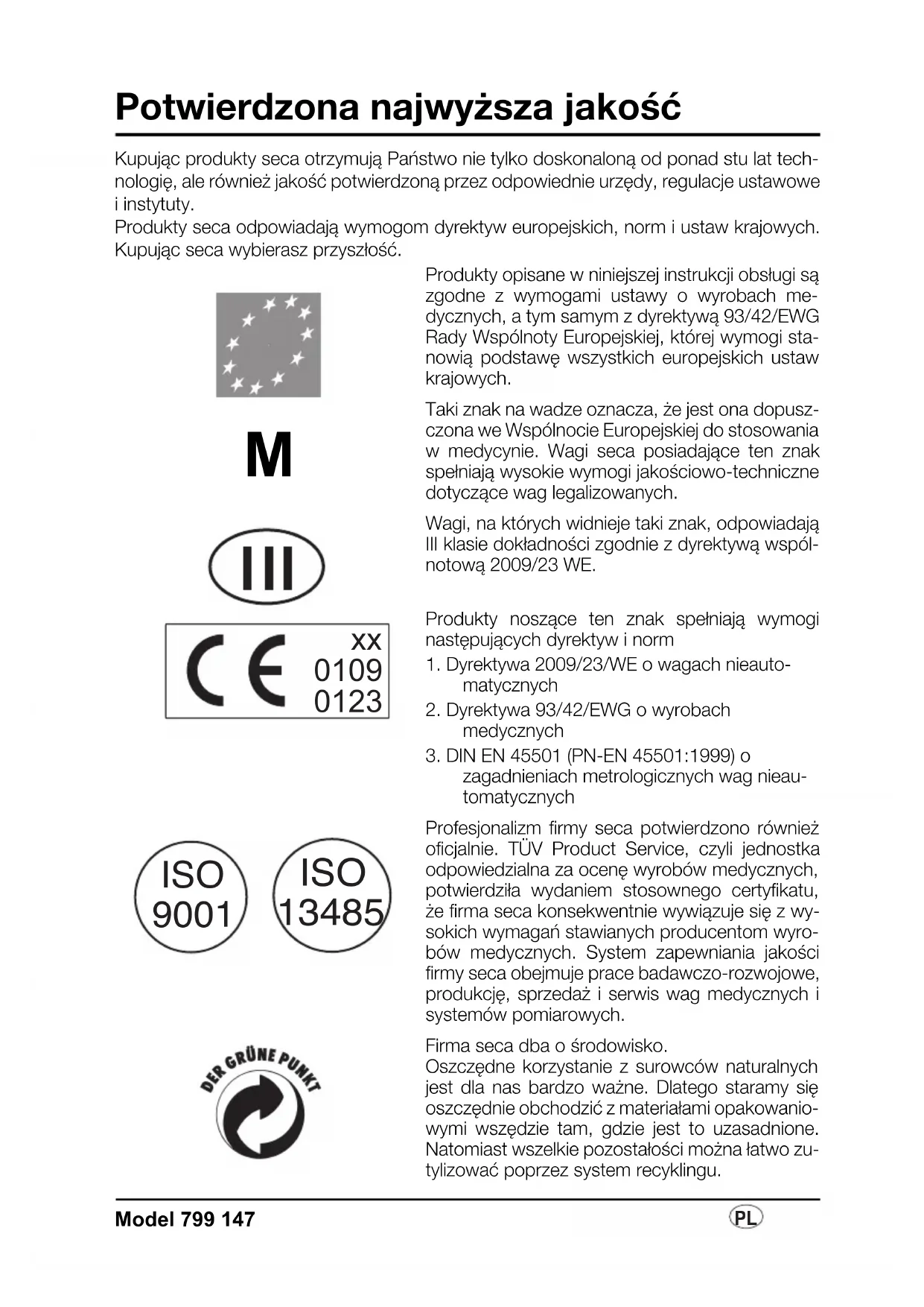 Produkty seca odpowiadają wymogom dyrektyw europejskich, norm i ustaw krajowych. Kupując seca wybierasz przyszłość.