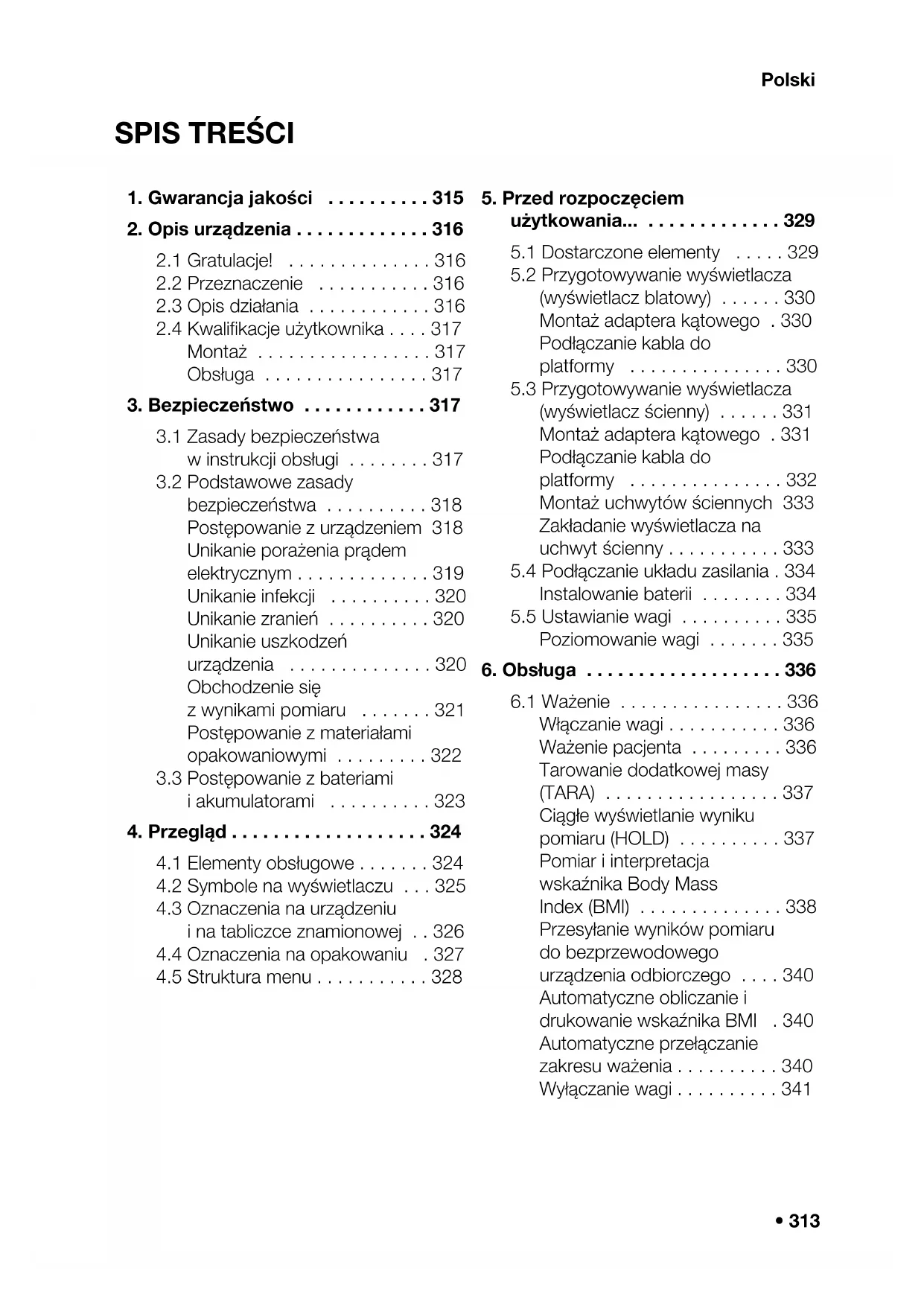 Przesyjanie wyników pomiaru do bezprzewodowej urzadzenia odbiorczyego .340 Automatyczne obliczanie i drukowania wskaźnika BMI .340 Automatyczne przyłączenia zakresu wazenia .340
