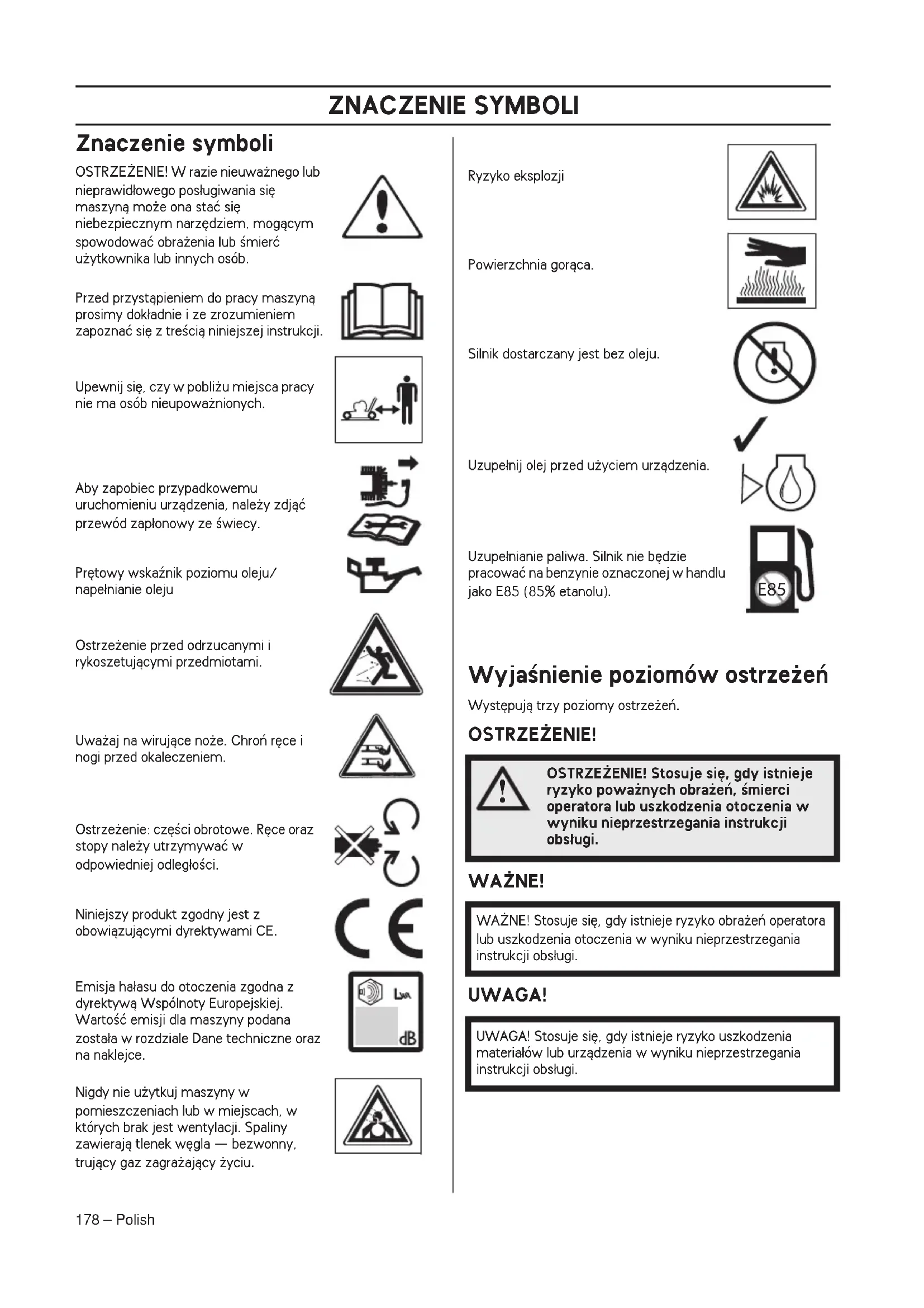 - OSTRZE˚ENIE! Stosuje si´, gdy istnieje ryzyko powa˝nych obra˝eƒ, Êmierci operatora lub uszkodzenia otoczenia w wyniku nieprzestrzegania instrukcji obs∏ugi. WA˚NE! Stosuje si´, gdy istnieje ryzyko obra˝eƒ operatora lub uszkodzenia otoczenia w wyniku nieprzestrzegania instrukcji obs∏ugi. UWAGA! Stosuje si´, gdy istnieje ryzyko uszkodzenia materia∏ów lub urzàdzenia w wyniku nieprzestrzegania instrukcji obs∏ugi. E85OPIS Polish – 179 Spis treÊci Szanowny Kliencie! Gratulujemy wyboru produktu Jonsered! JesteÊmy przekonani, ˝e przez d∏ugi czas b´dà Paƒstwo zadowoleni z jakoÊci i wydajnoÊci naszych produktów. Zakup jakiegokolwiek z naszych produktów daje mo˝liwoÊç korzystania z profesjonalnej pomocy i obs∏ugi technicznej, w razie koniecznoÊci przeprowadzenia naprawy lub serwisu. Je˝eli maszyna nie zosta∏a kupiona w autoryzowanym punkcie sprzeda˝y, prosimy zapytaç o najbli˝szy warsztat serwisowy. Mamy nadziej´, ˝e b´dà Paƒstwo zadowoleni ze swojej maszyny i ˝e b´dzie ona Paƒstwu s∏u˝yç przez d∏ugie lata. Prosimy pami´taç, ˝e niniejsza instrukcja obs∏ugi jest wa˝nym dokumentem, dzi´ki któremu maszyna zyskuje wi´kszà wartoÊç. Stosujàc si´ do zawartych w niej wskazówek (na temat u˝ytkowania, obs∏ugi technicznej, konserwacji itd.) mo˝na znacznie przed∏u˝yç okres u˝ytkowy maszyny, a tak˝e zwi´kszyç jej wartoÊç w przypadku sprzeda˝y. W razie sprzeda˝y maszyny nale˝y przekazaç nowemu u˝ytkownikowi tak˝e instrukcj´ obs∏ugi. ˚yczymy zadowolenia z posiadanego produktu Jonsered! Jonsered nieustannie modernizuje swoje wyroby, w zwiàzku z czym zastrzega sobie prawo do wprowadzania zmian dotyczàcych m.in. wyglàdu produktów bez uprzedzenia. ZNACZENIE SYMBOLI Znaczenie symboli p. 178