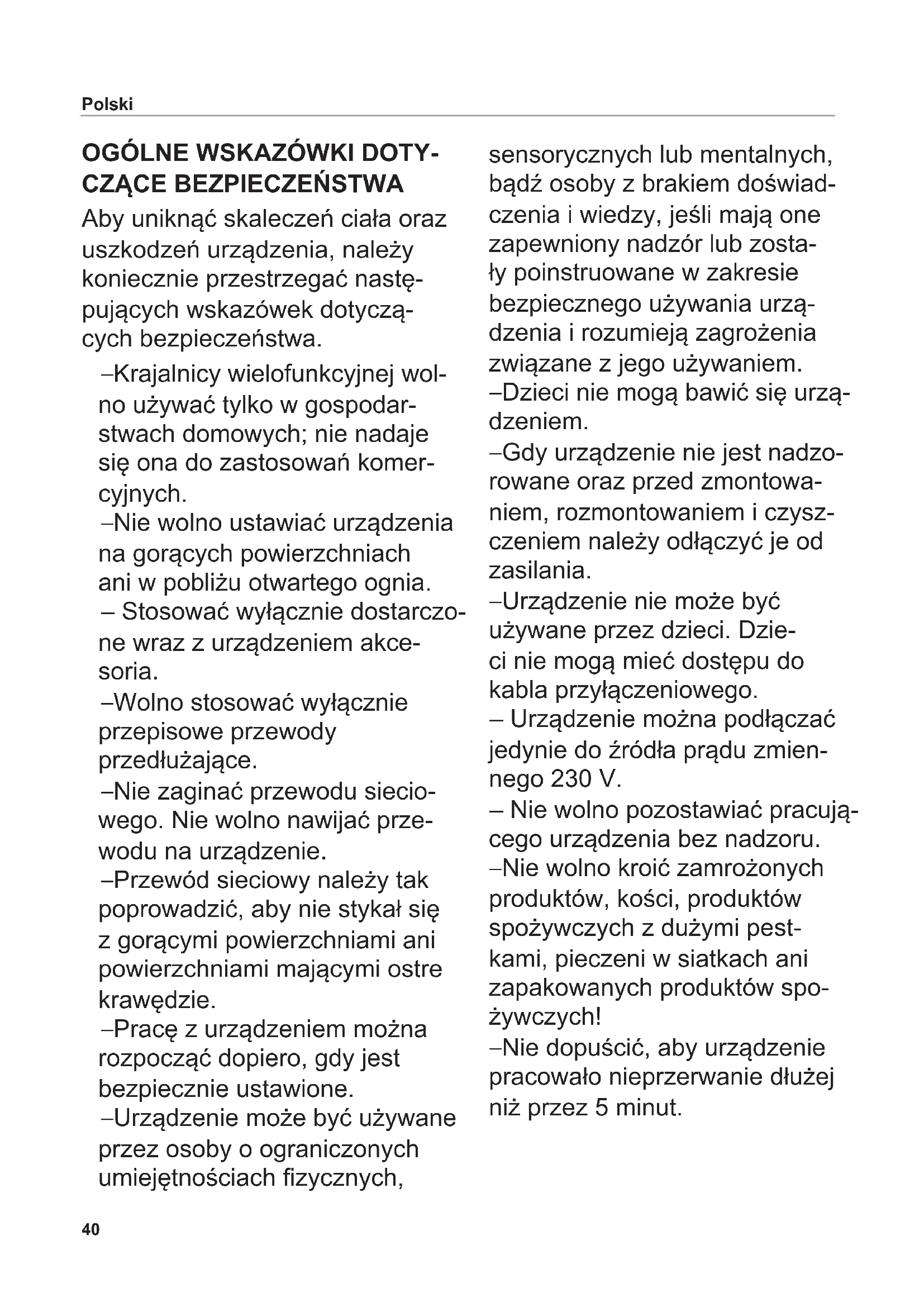 Aby uniknąć skaleczeń ciała oraz uszkodzeń urządzenia, należy koniecznie przestrzegać nastę- pujących wskazówek dotyczą- cych bezpieczeństwa. – Krajalnicy wielofunkcyjnej wol- no używać tylko w gospodar- stwach domowych; nie nadaje się ona do zastosowań komer- cyjnych. – Nie wolno ustawiać urządzenia na gorących powierzchniach ani w pobliżu otwartego ognia. – Stosować wyłącznie dostarczo- ne wraz z urządzeniem akce- soria. – Wolno stosować wyłącznie przepisowe przewody przedłużające. – Nie zaginać przewodu siecio- wego. Nie wolno nawijać prze- wodu na urządzenie. – Przewód sieciowy należy tak poprowadzić, aby nie stykał się z gorącymi powierzchniami ani powierzchniami mającymi ostre krawędzie. – Pracę z urządzeniem można rozpocząć dopiero, gdy jest bezpiecznie ustawione. – Urządzenie może być używane przez osoby o ograniczonych umiejętnościach zycznych, sensorycznych lub mentalnych, bądź osoby z brakiem doświad- czenia i wiedzy, jeśli mają one zapewniony nadzór lub zosta- ły poinstruowane w zakresie bezpiecznego używania urzą- dzenia i rozumieją zagrożenia związane z jego używaniem. – Dzieci nie mogą bawić się urzą- dzeniem. – Gdy urządzenie nie jest nadzo- rowane oraz przed zmontowa- niem, rozmontowaniem i czysz- czeniem należy odłączyć je od zasilania. – Urządzenie nie może być używane przez dzieci. Dzie- ci nie mogą mieć dostępu do kabla przyłączeniowego. – Urządzenie można podłączać jedynie do źródła prądu zmien- nego 230 V. – Nie wolno pozostawiać pracują- cego urządzenia bez nadzoru. – Nie wolno kroić zamrożonych produktów, kości, produktów spożywczych z dużymi pest- kami, pieczeni w siatkach ani zapakowanych produktów spo- żywczych! – Nie dopuścić, aby urządzenie pracowało nieprzerwanie dłużej niż przez 5 minut.41 Polski Niebezpieczeństwo porażenia prądem – W przypadku zakłóceń w pracy, zawsze przed przystąpieniem do czyszczenia urządzenia oraz gdy urządzenie nie jest używane, trzeba wyciągnąć wtyczkę z gniazda sieciowego. Należy ciągnąć za wtyczkę, nie za przewód. – Nie wolno zanurzać urządzenia w wodzie. Nie wolno wysta- wiać urządzenia na deszcz ani w inny sposób narażać na działanie wilgoci. Jeżeli urządzenie wpadnie do wody, najpierw należy wyciągnąć wtyczkę z gniazda sieciowego i dopiero potem wyjąć urządzenie z wody. Przed ponownym uruchomieniem urządzenia zlecić jego kontrolę w autoryzowanym punkcie ser- wisowym. – Nie dotykać urządzenia wilgot- nymi rękami. Nie używać urzą- dzenia, stojąc na wilgotnym lub mokrym podłożu bądź jeżeli urządzenie jest wilgotne albo mokre. Nie używać urządzenia na zewnątrz pomieszczeń. – Urządzenie należy natych- miast wyłączyć w przypadku stwierdzenia uszkodzeń ele- mentów urządzenia. Należy przesłać kompletne urządzenie do punktu obsługi klienta rmy ritterwerk. – Uszkodzony przewód zasila- jący musi zostać wymienio- ny przez producenta, punkt obsługi klienta producenta lub inne wykwalikowane osoby; pozwoli to uniknąć zagrożeń. Niebezpieczeństwo skaleczenia – Nie wolno używać niniejsze- go urządzenia bez prowad- nicy produktów i popychacza małych produktów, chyba że wielkość i kształt krojonego produktu na to nie pozwalają. – Przed wymianą akcesoriów lub elementów dodatkowych, które poruszają się podczas pracy, urządzenie należy wyłączyć i odłączyć od napięcia siecio- wego. – Nóż obrotowy jest bardzo ostry. – Podczas pracy urządzenia nie wolno nigdy dotykać noża obro- towego! – Przed przystąpieniem do czyszczenia urządzenia należy je wyłączyć, wyciągnąć wtycz- kę z gniazdka i przestawić pokrętło regulacji grubości krojenia do pozycji „0”. – Po wyłączeniu urządzenia nóż obraca się jeszcze przez chwilę.42 Rozłożyć ilustracje znajdujące się za przednią oraz tylną okładką instrukcji. Przed uruchomieniem urządze- nia należy dokładnie przeczytać instrukcję obsługi. Zachować instrukcję obsługi i w przypadku przekazania urządzenia następ- nemu użytkownikowi przekazać ją wraz z urządzeniem. PRZEZNACZENIE Krajalnica wielofunkcyjna prze- znaczona jest do krojenia pro- duktów spożywczych używanych w gospodarstwie domowym. Użycie niezgodne z przeznacze- niem lub niewłaściwa obsługa mogą spowodować poważne skaleczenia ciała lub uszkodze- nie urządzenia. W konsekwencji wygasają wszelkie prawa z tytułu gwarancji i rękojmi. URUCHOMIENIE Przygotowanie Wyjąć ostrożnie urządzenie z opakowania. Usunąć wszystkie elementy opakowania, należy przechowywać je wraz z opa- kowaniem. Przed kontaktem urządzenia z artykułami spożyw- czymi należy je oczyścić (patrz: CZYSZCZENIE). Ustawianie urządzenia