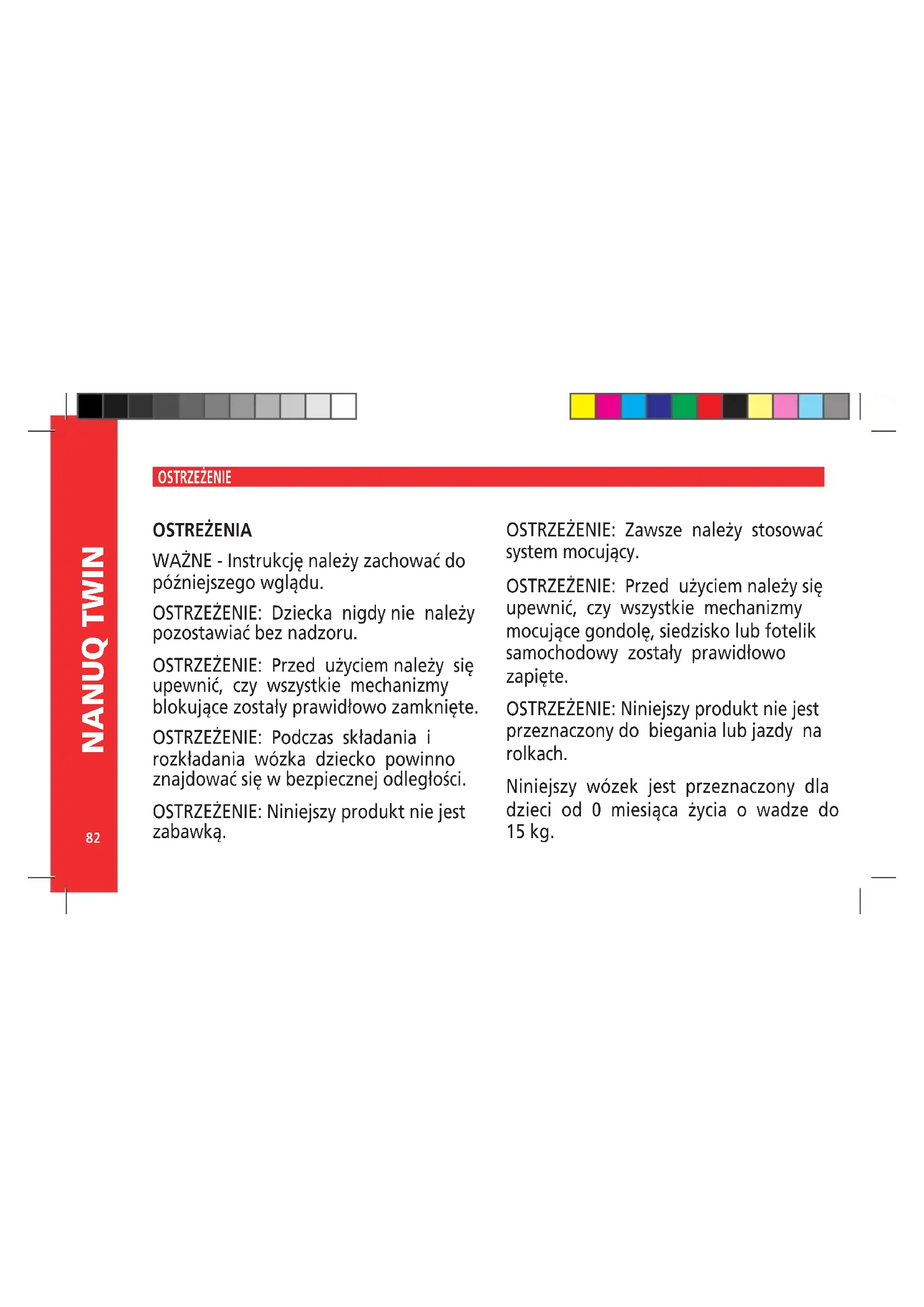 OSTRZEŻENIE: Należy koniecznie upewnić się, czy dziecko znajduje się z dala od wózka podczas czynności składania i rozkładania. OSTRZEŻENIE: Pojawienie się miejsc przecięcia, ściśnięcia oraz przytrzaśnięć jest nieuniknione podczas w/w czynności.