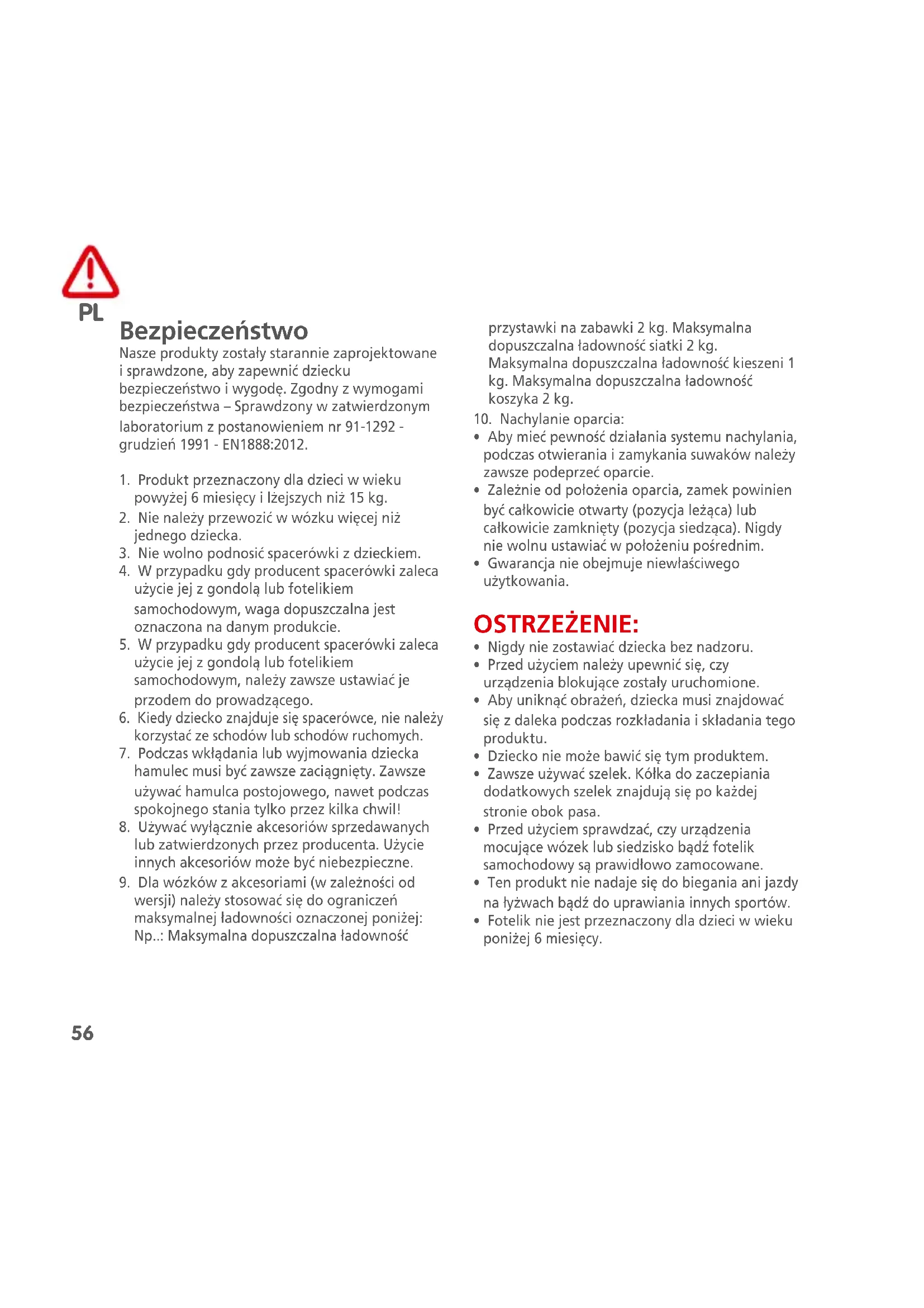 został wyprodukowany zgodnie z aktualnymi wymogami europejskich norm bezpieczeństwa i jakości, które mają do niego zastosowanie, a także że w chwili zakupu produkt jest wolny od wad wykonania i materiałowych. Nasza 24-miesięczna gwarancja obejmuje wszelkie wady produkcyjne w zakresie materiałów i robocizny, pod warunkiem, że produkt jest użytkowany w normalnych warunkach i zgodnie z naszą instrukcją obsługi. Przejmujemy odpowiedzialność za naprawę lub wymianę produktu dotkniętego wadą objętą gwarancją, z tym zastrzeżeniem, że o wyborze sposobu usunięcia wady i rozpatrzenia zgłoszenia decyduje gwarant. W przypadku wystąpienia z żądaniem usunięcia wady objętej gwarancją, konieczne jest przedstawienie dowodu zakupu, którego dokonano w ciągu 24 miesięcy poprzedzających zgłoszenie serwisowe. Nasza 24-miesięczna gwarancja nie obejmuje uszkodzeń spowodowanych poprzez normalne zużycie, wypadki, niewłaściwe używanie, zaniedbanie lub niestosowanie się do instrukcji obsługi. Przykłady normalnego zużycia to m.in. zużycie kół i tkaniny spowodowane regularnym użytkowaniem, a także naturalna utrata kolorów oraz pogorszenie jakości materiałów spowodowane dłuższym czasem użytkowania. Co zrobić w przypadku wykrycia wad: W razie pojawienia się problemów lub wad zalecamy kontakt z najbliższym punktem serwisowym marki ( MARKA) ( adresy na okładce książeczki zawierającej instrukcję lub stronie internetowej) który jest zobowiązany do przestrzegania naszej 24-miesięczne gwarancji(1). Należy przedstawić dowód zakupu, którego dokonano w ciągu 24 miesięcy poprzedzających zgłoszenie serwisowe. Najlepiej jeżeli żądanie naprawy zostanie wstępnie zatwierdzone przez Dział serwisowy firmy [Marka]. W przypadku gdy zaistnieje konieczność wysłania produktu do punktu serwisowego proszę uzgodnić sposób wysyłki i jego koszty z punktem serwisowym, ponieważ w przypadku braku takiego uzgodnienia gwarant może odmówić pokrycia kosztów przesyłki.. Uszkodzenia, których nasza gwarancja nie obejmuje mogą zostać naprawione za uzgodnionym wynagrodzeniem. Niniejsza gwarancja jest zgodna z dyrektywą europejską 99/44/WE z dnia 25 maja 1999 roku. Niniejsza gwarancja nie wyłącza, nie ogranicza ani nie zawiesza uprawnień kupującego wynikających z niezgodności towaru z umową, przewidzianych w ustawie z dn. 27.07.2002 o szczególnych warunkach sprzedaży konsumenckiej oraz o zmianie Kodeksu cywilnego (Dz. Ust. 2002 nr 141 poz. 1176 z póź. zmianami). (1) Produkty zakupione od sprzedawców detalicznych lub dealerów z usuniętymi albo zmienionymi etykietami lub numerami identyfikacyjnymi uważane są za nieautoryzowane. W związku z tym, że autentyczność takich produktów nie może być ustalona, gwarancja ich nie obejmuje. 58(