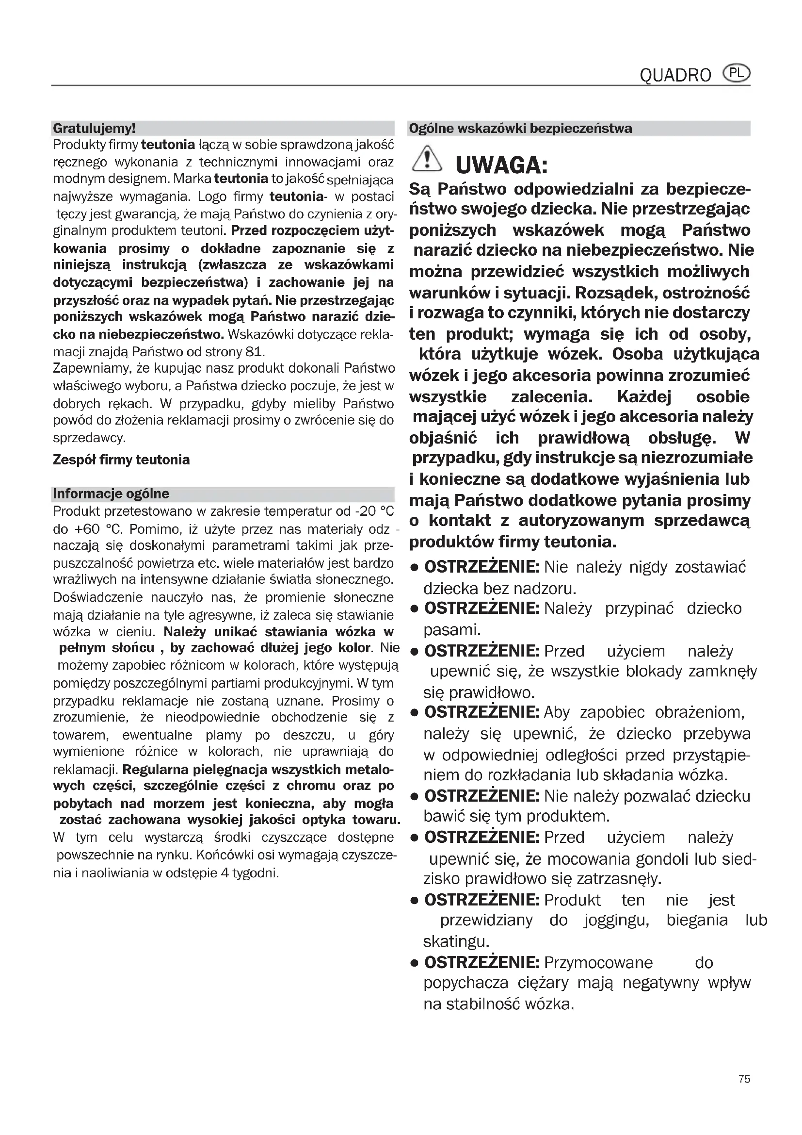 Gratuluj Produkty ręcznego modnym najwyższ tęczy jes ginalnym kowania niniejsz dotyczą przyszło poniższy cko na n macji zn Zapewni właściwe dobrych powód d sprzedaw Zespół f Informa Produkt do +60 naczają puszczal wrażliwy Doświad mają dzi wózka w pełnym możemy pomiędz przypadk zrozumie towarem wymienio reklama wych cz pobytac zostać z W tym powszec nia i nao Quadro_in_mistral_s_08_in.qxd 12.10.11 13:40 Seite 74QUADRO Ogólne wskazówki bezpieczeństwa UWAGA: Są Państwo odpowiedzialni za bezpiecze- ństwo swojego dziecka. Nie przestrzegając poniższych wskazówek mogą Państwo narazić dziecko na niebezpieczeństwo. Nie można przewidzieć wszystkich możliwych warunków i sytuacji. Rozsądek, ostrożność i rozwaga to czynniki, których nie dostarczy ten produkt; wymaga się ich od osoby, która użytkuje wózek. Osoba użytkująca wózek i jego akcesoria powinna zrozumieć wszystkie zalecenia. Każdej osobie mającej użyć wózek i jego akcesoria należy objaśnić ich prawidłową obsługę. W przypadku, gdy instrukcje są niezrozumiałe i konieczne są dodatkowe wyjaśnienia lub mają Państwo dodatkowe pytania prosimy o kontakt z autoryzowanym sprzedawcą produktów firmy teutonia. ● OSTRZEŻENIE: Nie należy nigdy zostawiać dziecka bez nadzoru. ● OSTRZEŻENIE: Należy przypinać dziecko pasami. ● OSTRZEŻENIE: Przed użyciem należy upewnić się, że wszystkie blokady zamknęły się prawidłowo. ● OSTRZEŻENIE: Aby zapobiec obrażeniom, należy się upewnić, że dziecko przebywa w odpowiedniej odległości przed przystąpie- niem do rozkładania lub składania wózka. ● OSTRZEŻENIE: Nie należy pozwalać dziecku bawić się tym produktem. ● OSTRZEŻENIE: Przed użyciem należy upewnić się, że mocowania gondoli lub sied- zisko prawidłowo się zatrzasnęły. ● OSTRZEŻENIE: Produkt ten nie jest przewidziany do joggingu, biegania lub skatingu. ● OSTRZEŻENIE: Przymocowane do popychacza ciężary mają negatywny wpływ na stabilność wózka.
