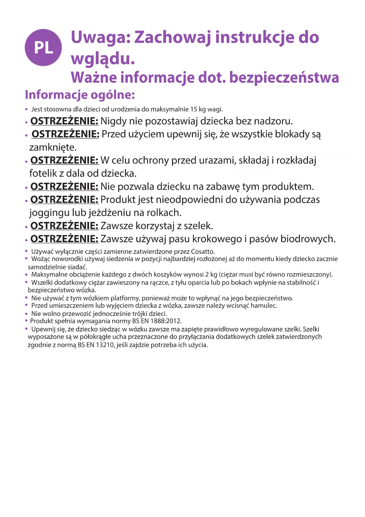 - Konserwacja - Regularnie poddawać blokady, hamulce, koła, szelki, zaciski, gałki regulujące fotelika, połączenia i osprzęt kontrolom, aby zagwarantować ich bezpieczne i prawidłowe działanie. Elementy powinny swobodnie przemieszczać się. Koła powinny kręcić się swobodnie i wymagać minimalnej konserwacji. Natomiast regularne stosowanie niewielkiej ilość substancji smarującej w aerozolu np. silikonu (nie używaj oleju ani smaru) wydłuży okres eksploatacji wózka i ułatwi jego składanie. Wózek należy poddawać serwisowaniu i odnowić go przed użyciem z drugim dzieckiem lub po 18 miesiącach, w zależności od tego co nastąpi wcześniej. Zapoznaj się z ostrzeżeniem XX Prawidłowe działanie Nieprawidłowe działanie Słyszalny dźwięk Powtórz czynność X razy Strzałka ogólnego działania Zablokuj Odblokuj Przyciśnij i przytrzymaj Sprawdź Przejdź do kroku XX Powtórz po drugiej stronie Wizualny słowniczek: Lista części: S1: Osłony na rączki z gąbki S2: Koniec rączki S3: Budka S4: Tapicerka fotelika S5: Usztywnienie oparcia (zestaw) Części zamienne przedstawione poniżej są dostępne dla niniejszego produktu. Klienci z Wielkiej Brytanii i Irlandii mogą zamówić swoje części zamienne korzystając ze strony: http://www.cosatto.com/service-centre/spares Klienci spoza terenu Wielkiej Brytanii i Irlandii, powinni skontaktować się ze swoim lokalnym dystrybutorem, którego informacje kontaktowe znajdują się na stronie: http://www.cosatto.com/stockists Dodatkową pomoc można uzyskać pisząc na adres: cuddle@cosatto.com. Części zamienne: Zapoznaj się z rysunkiem: P1: Wózek P2: Budka P3: Folia przeciwdeszczowa S6: Szelki S7: Folia przeciwdeszczowa S8: Podnóżek S9: Przednie koła S10: Nakładka koła S11: Pokrowiec na nóżki S12: Tylne koła S13: Pokrycie fotelikaProsimy zapoznać się z następującymi schematami: Wózek Hamulec Zatrzask obrotowy przedniego koła Rączka Szelki Oparcie Wsparcie łydek Koszyk Budka Folia przeciwdeszczowa Tapicerka fotelika Wózek