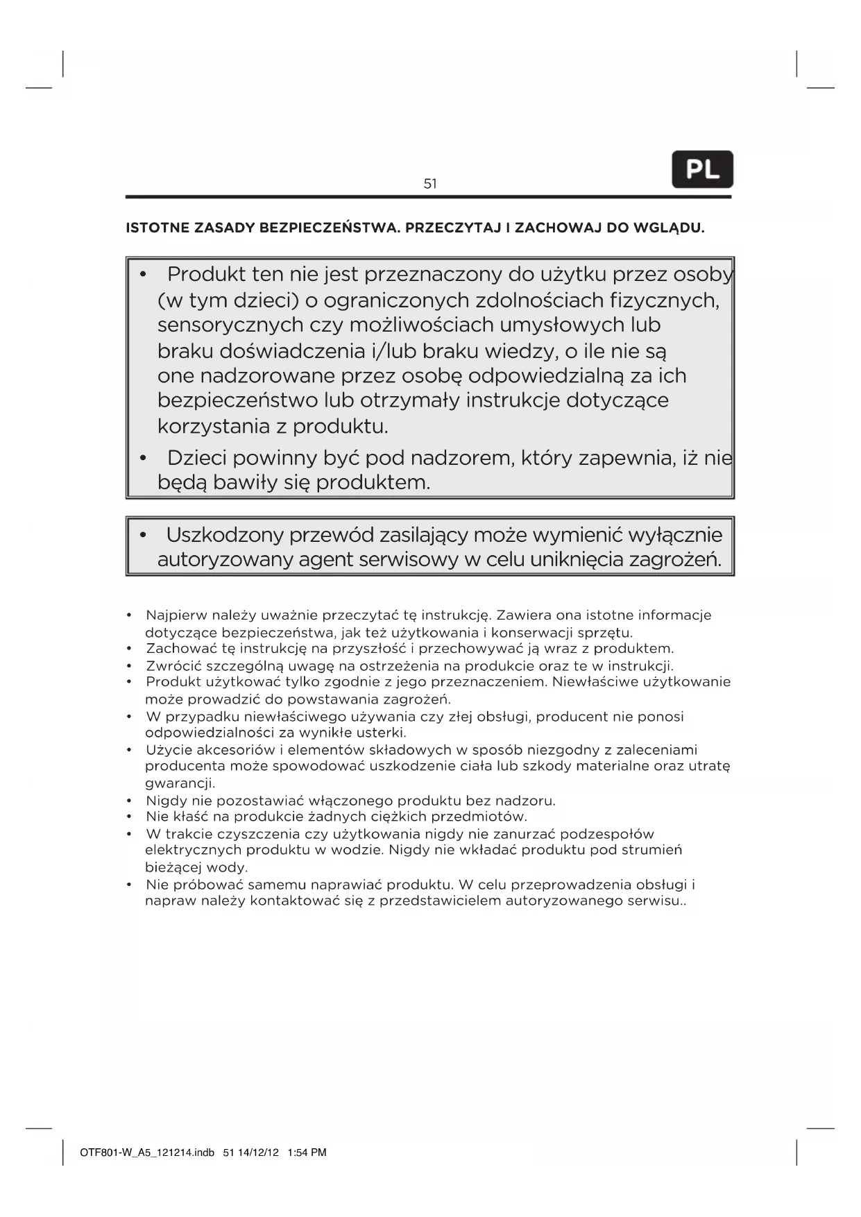 - Niepróbowaćsamemunaprawiaćproduktu.Wceluprzeprowadzeniaobsługii naprawnależykontaktowaćsięzprzedstawicielemautoryzowanegoserwisu.. OTF801-W_A5_121214.indb 51 14/12/12 1:54 PM52 Size - A5