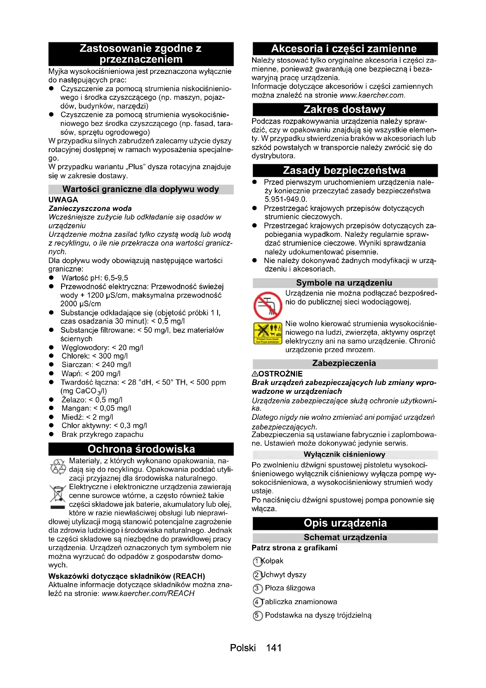 /l) Żelazo: < 0,5 mg/l Mangan: < 0,05 mg/l Miedź: < 2 mg/l Chlor aktywny: < 0,3 mg/l Brak przykrego zapachu Ochrona środowiska Materiały, z których wykonano opakowania, na- dają się do recyklingu. Opakowania poddać utyli- zacji przyjaznej dla środowiska naturalnego. Elektryczne i elektroniczne urządzenia zawierają cenne surowce wtórne, a często również takie części składowe jak baterie, akumulatory lub olej, które w razie niewłaściwej obsługi lub nieprawi- dłowej utylizacji mogą stanowić potencjalne zagrożenie dla zdrowia ludzkiego i środowiska naturalnego. Jednak te części składowe są niezbędne do prawidłowej pracy urządzenia. Urządzeń oznaczonych tym symbolem nie można wyrzucać do odpadów z gospodarstw domo- wych. Wskazówki dotyczące składników (REACH) Aktualne informacje dotyczące składników można zna- leźć na stronie: www.kaercher.com/REACH Akcesoria i części zamienne Należy stosować tylko oryginalne akcesoria i części za- mienne, ponieważ gwarantują one bezpieczną i beza- waryjną pracę urządzenia. Informacje dotyczące akcesoriów i części zamiennych można znaleźć na stronie www.kaercher.com. Zakres dostawy Podczas rozpakowywania urządzenia należy spraw- dzić, czy w opakowaniu znajdują się wszystkie elemen- ty. W przypadku stwierdzenia braków w akcesoriach lub szkód powstałych w transporcie należy zwrócić się do dystrybutora. Zasady bezpieczeństwa Przed pierwszym uruchomieniem urządzenia nale- ży koniecznie przeczytać zasady bezpieczeństwa 5.951-949.0. Przestrzegać krajowych przepisów dotyczących strumienic cieczowych. Przestrzegać krajowych przepisów dotyczących za- pobiegania wypadkom. Należy regularnie spraw- dzać strumienice cieczowe. Wyniki sprawdzania należy udokumentować pisemnie. Nie należy dokonywać żadnych modyfikacji w urzą- dzeniu i akcesoriach. Symbole na urządzeniu Urządzenia nie można podłączać bezpośred- nio do publicznej sieci wodociągowej. Nie wolno kierować strumienia wysokociśnie- niowego na ludzi, zwierzęta, aktywny osprzęt elektryczny ani na samo urządzenie. Chronić urządzenie przed mrozem. Zabezpieczenia 몇 OSTROŻNIE Brak urządzeń zabezpieczających lub zmiany wpro- wadzone w urządzeniach Urządzenia zabezpieczające służą ochronie użytkowni- ka. Dlatego nigdy nie wolno zmieniać ani pomijać urządzeń zabezpieczających. Zabezpieczenia są ustawiane fabrycznie i zaplombowa- ne. Ustawień może dokonywać jedynie serwis. Wyłącznik ciśnieniowy Po zwolnieniu dźwigni spustowej pistoletu wysokoci- śnieniowego wyłącznik ciśnieniowy wyłącza pompę wy- sokociśnieniowa, a wysokociśnieniowy strumień wody ustaje. Po naciśnięciu dźwigni spustowej pompa ponownie się włącza. Opis urządzenia Schemat urządzenia Patrz strona z grafikami 1 Kołpak 2 Uchwyt dyszy 3 Płoza ślizgowa 4 Tabliczka znamionowa 5 Podstawka na dyszę trójdzielną142 Polski 6 Uchwyt transportowy do oczyszczacza powierzch- niowego 7 Odblokowanie pałąka przesuwnego 8 Pałąk przesuwny, dół (wsunięty) 9 Pałąk przesuwny, góra (wysunięty) 10 Dysza wysokociśnieniowa 11 Oznaczenie dyszy wysokociśnieniowej 12 Lanca EASY!Lock 13 Pistolet wysokociśnieniowy EASY!Force 14 Zaczep zabezpieczający 15 Dźwignia spustowa 16 Dźwignia zabezpieczająca 17 Wąż wysokociśnieniowy EASY!Lock 18 Podstawka węża19 Uchwyt kabla20 Wspornik lancy bez zacisku 21 Taśma gumowa (nie dotyczy urządzeń z bębnem do zwijania węża) 22 Podstawka na dyszę rotacyjną (dysza rotacyjna znajduje się w zakresie dostawy tylko w wariancie „Plus”) 23 Wspornik lancy z zaciskiem do transportu 24 Przełącznik urządzenia 25 Uchwyt 26 Przyłącze wysokiego ciśnienia EASY!Lock 27 Uchwyt28 Przyłącze wody 29 Wąż ssący środka czyszczącego z filtrem i dozow- nikiem środka czyszczącego 30 Sitko31 Króciec węża 32 Nakrętka kołpakowa 33 Korba 34 Bęben do zwijania węża Kolor oznaczenia Elementy obsługowe procesu czyszczenia są żółte. Elementy obsługowe konserwacji i serwisu są ja- snoszare. Montaż Mocowanie kołpaków Zamocować kołpaki Montaż akcesoriów Wskazówka System EASY!Lock szybko i pewnie łączy podzespoły dzięki szybkozłączce gwintowanej i wykonaniu tylko jednego obrotu.