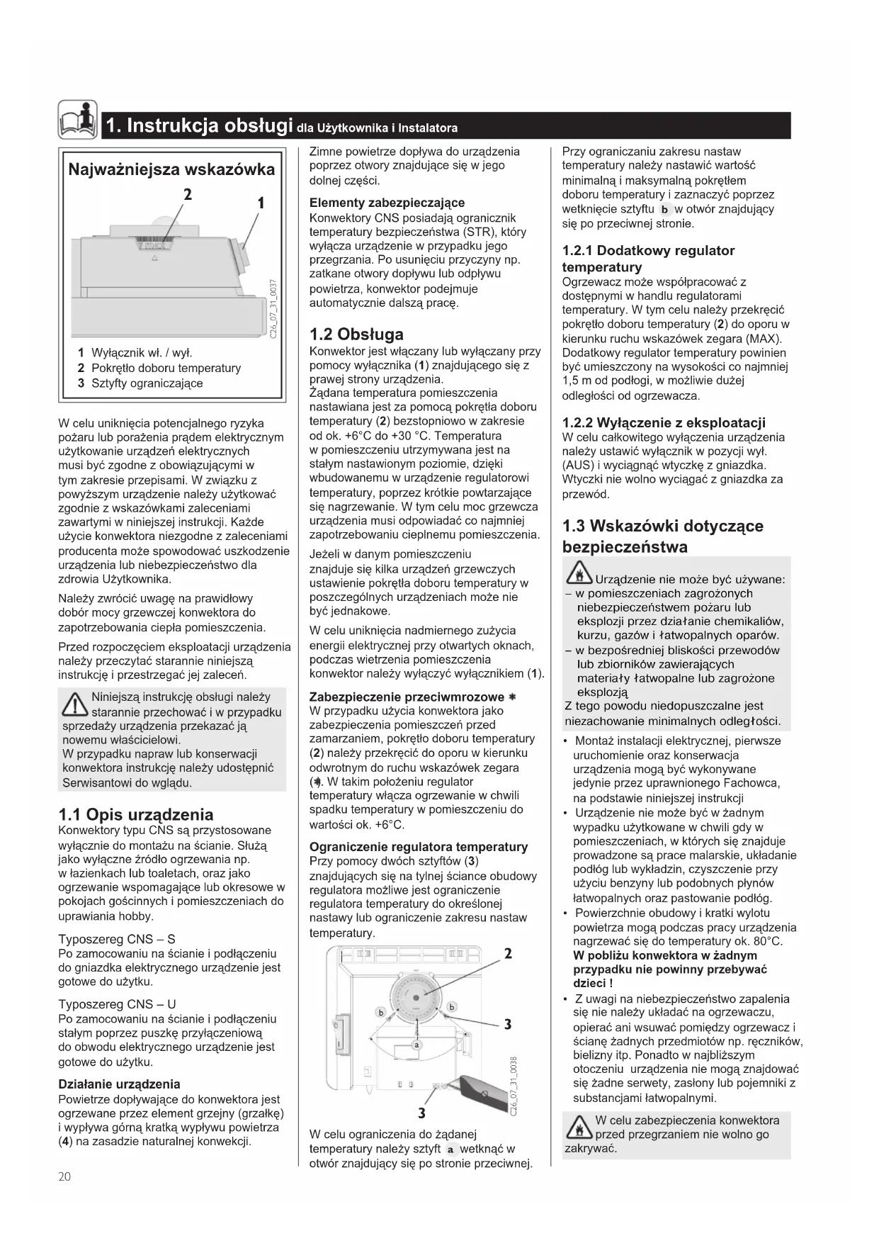 - Z uwagi na niebezpieczeństwo zapalenia się nie należy układać na ogrzewaczu, opierać ani wsuwać pomiędzy ogrzewacz i ścianę żadnych przedmiotów np. ręczników, bielizny itp. Ponadto w najbliższym otoczeniu urządzenia nie mogą znajdować się żadne serwety, zasłony lub pojemniki z substancjami łatwopalnymi.W celu zabezpieczenia konwektora przed przegrzaniem nie wolno go zakrywać.Zimne powietrze dopływa do urządzenia poprzez otwory znajdujące się w jego dolnej części. Elementy zabezpieczające Konwektory CNS posiadają ogranicznik temperatury bezpieczeństwa (STR), który wyłącza urządzenie w przypadku jego przegrzania. Po usunięciu przyczyny np. zatkane otwory dopływu lub odpływu powietrza, konwektor podejmuje automatycznie dalszą pracę.