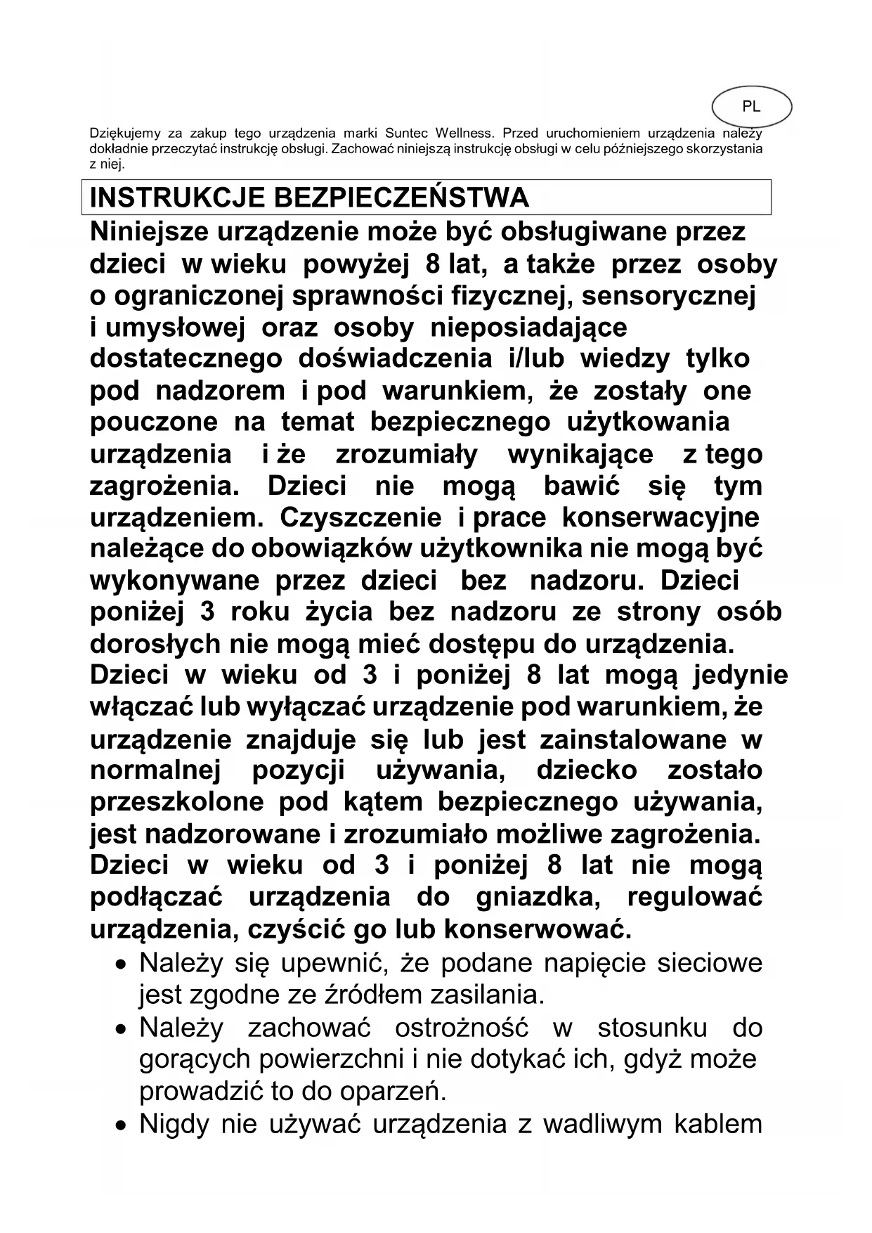 Niniejsze urządzenie może być obsługiwane przez dzieci w wieku powyżej 8 lat, a także przez osoby o ograniczonej sprawności fizycznej, sensorycznej i umysłowej oraz osoby nieposiadające dostatecznego doświadczenia i/lub wiedzy tylko pod nadzorem i pod warunkiem, że zostały one pouczone na temat bezpiecznego użytkowania urządzenia i że zrozumiały wynikające z tego zagrożenia. Dzieci nie mogą bawić się tym urządzeniem. Czyszczenie i prace konserwacyjne należące do obowiązków użytkownika nie mogą być wykonywane przez dzieci bez nadzoru. Dzieci poniżej 3 roku życia bez nadzoru ze strony osób dorosłych nie mogą mieć dostępu do urządzenia. Dzieci w wieku od 3 i poniżej 8 lat mogą jedynie włączać lub wyłączać urządzenie pod warunkiem, że urządzenie znajduje się lub jest zainstalowane w normalnej pozycji używania, dziecko zostało przeszkolone pod kątem bezpiecznego używania, jest nadzorowane i zrozumiało możliwe zagrożenia. Dzieci w wieku od 3 i poniżej 8 lat nie mogą podłączać urządzenia do gniazdka, regulować urządzenia, czyścić go lub konserwować.