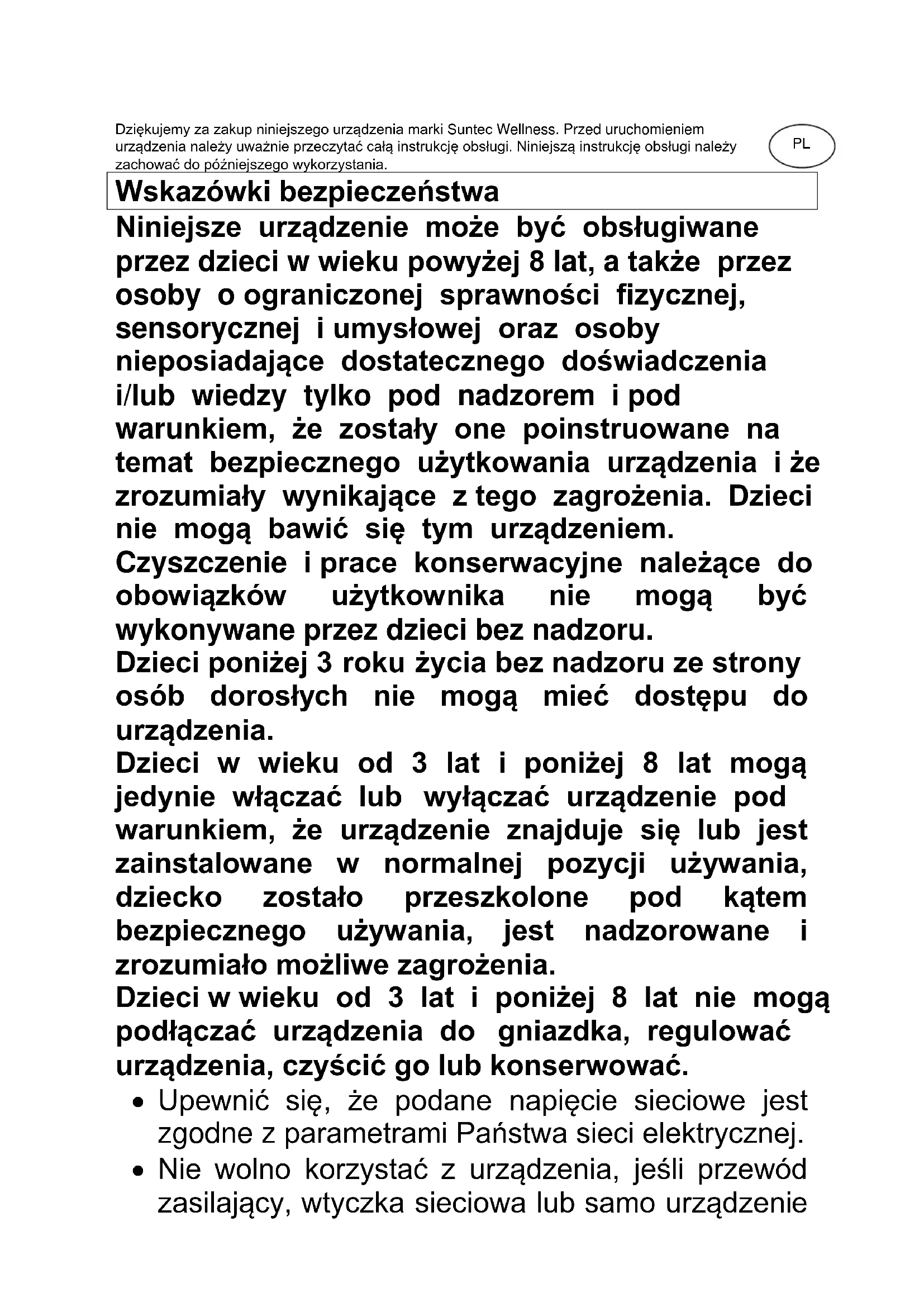 Heat Safe SUNTEC WELLNESS GMBH / HOLZSTRASSE 2 / 40221 DÜSSELDORF / GERMANYPL Dziękujemy za zakup niniejszego urządzenia marki Suntec Wellness. Przed uruchomieniem urządzenia należy uważnie przeczytać całą instrukcję obsługi. Niniejszą instrukcję obsługi należy zachować do późniejszego wykorzystania. Wskazówki bezpieczeństwa Niniejsze urządzenie może być obsługiwane przez dzieci w wieku powyżej 8 lat, a także przez osoby o ograniczonej sprawności fizycznej, sensorycznej i umysłowej oraz osoby nieposiadające dostatecznego doświadczenia i/lub wiedzy tylko pod nadzorem i pod warunkiem, że zostały one poinstruowane na temat bezpiecznego użytkowania urządzenia i że zrozumiały wynikające z tego zagrożenia. Dzieci nie mogą bawić się tym urządzeniem. Czyszczenie i prace konserwacyjne należące do obowiązków użytkownika nie mogą być wykonywane przez dzieci bez nadzoru. Dzieci poniżej 3 roku życia bez nadzoru ze strony osób dorosłych nie mogą mieć dostępu do urządzenia. Dzieci w wieku od 3 lat i poniżej 8 lat mogą jedynie włączać lub wyłączać urządzenie pod warunkiem, że urządzenie znajduje się lub jest zainstalowane w normalnej pozycji używania, dziecko zostało przeszkolone pod kątem bezpiecznego używania, jest nadzorowane i zrozumiało możliwe zagrożenia. Dzieci w wieku od 3 lat i poniżej 8 lat nie mogą podłączać urządzenia do gniazdka, regulować urządzenia, czyścić go lub konserwować.