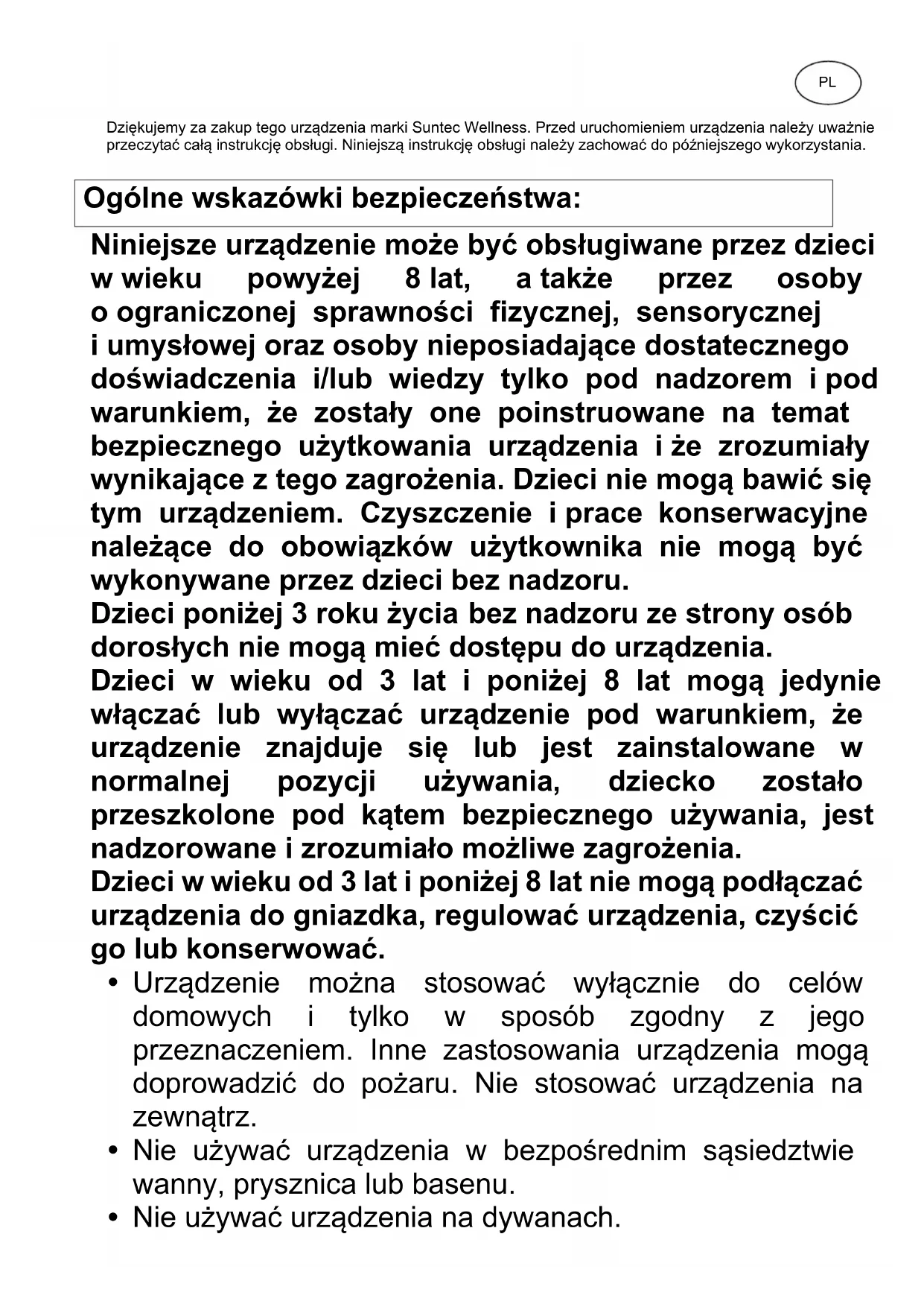 Dziękujemy za zakup tego urządzenia marki Suntec Wellness. Przed uruchomieniem urządzenia należy uważnie przeczytać całą instrukcję obsługi. Niniejszą instrukcję obsługi należy zachować do późniejszego wykorzystania. Niniejsze urządzenie może być obsługiwane przez dzieci w wieku powyżej 8 lat, a także przez osoby o ograniczonej sprawności fizycznej, sensorycznej i umysłowej oraz osoby nieposiadające dostatecznego doświadczenia i/lub wiedzy tylko pod nadzorem i pod warunkiem, że zostały one poinstruowane na temat bezpiecznego użytkowania urządzenia i że zrozumiały wynikające z tego zagrożenia. Dzieci nie mogą bawić się tym urządzeniem. Czyszczenie i prace konserwacyjne należące do obowiązków użytkownika nie mogą być wykonywane przez dzieci bez nadzoru. Dzieci poniżej 3 roku życia bez nadzoru ze strony osób dorosłych nie mogą mieć dostępu do urządzenia. Dzieci w wieku od 3 lat i poniżej 8 lat mogą jedynie włączać lub wyłączać urządzenie pod warunkiem, że urządzenie znajduje się lub jest zainstalowane w normalnej pozycji używania, dziecko zostało przeszkolone pod kątem bezpiecznego używania, jest nadzorowane i zrozumiało możliwe zagrożenia. Dzieci w wieku od 3 lat i poniżej 8 lat nie mogą podłączać urządzenia do gniazdka, regulować urządzenia, czyścić go lub konserwować.