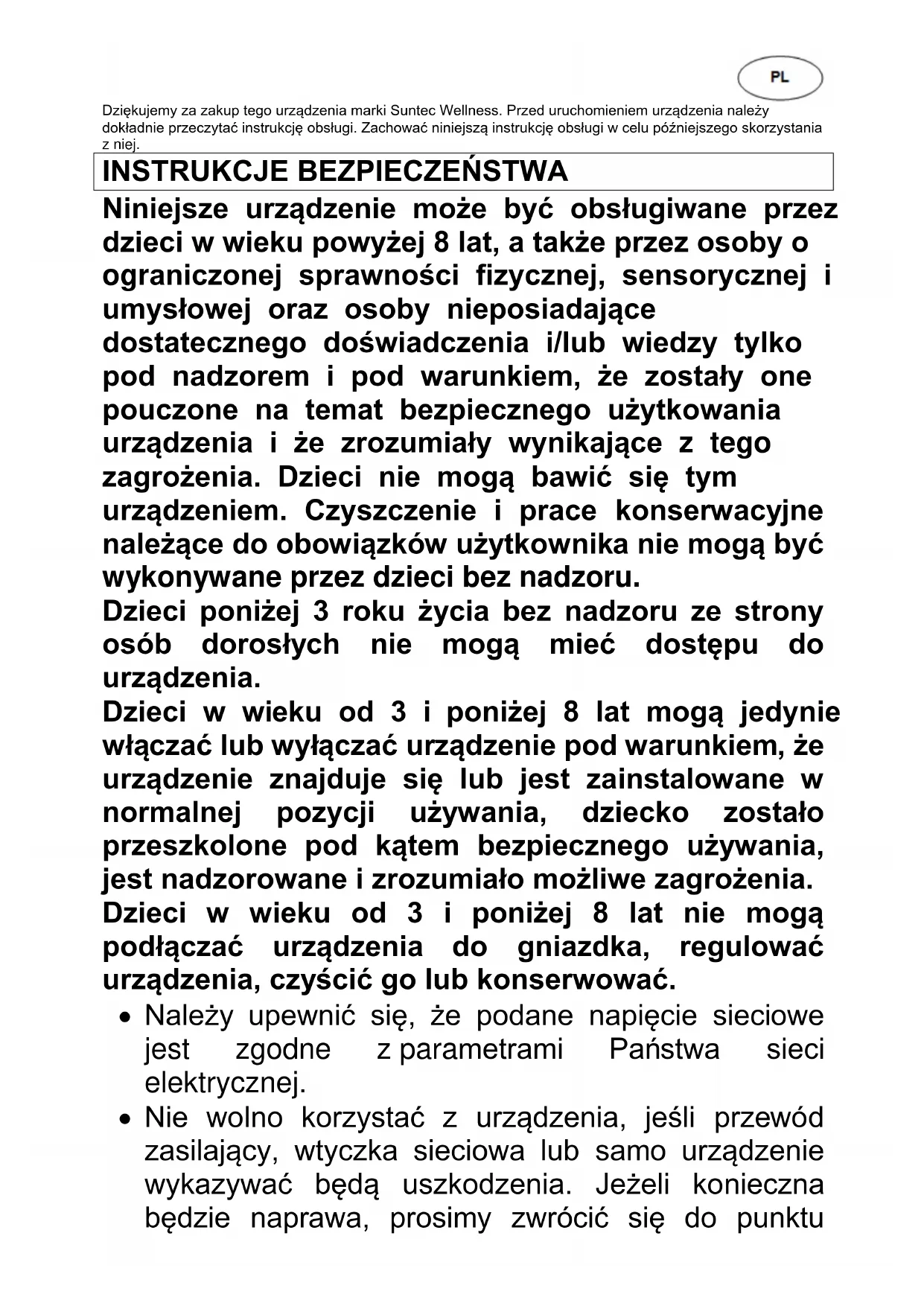 Niniejsze urządzenie może być obsługiwane przez dzieci w wieku powyżej 8 lat, a także przez osoby o ograniczonej sprawności fizycznej, sensorycznej i umysłowej oraz osoby nieposiadające dostatecznego doświadczenia i/lub wiedzy tylko pod nadzorem i pod warunkiem, że zostały one pouczone na temat bezpiecznego użytkowania urządzenia i że zrozumiały wynikające z tego zagrożenia. Dzieci nie mogą bawić się tym urządzeniem. Czyszczenie i prace konserwacyjne należące do obowiązków użytkownika nie mogą być wykonywane przez dzieci bez nadzoru. Dzieci poniżej 3 roku życia bez nadzoru ze strony osób dorosłych nie mogą mieć dostępu do urządzenia. Dzieci w wieku od 3 i poniżej 8 lat mogą jedynie włączać lub wyłączać urządzenie pod warunkiem, że urządzenie znajduje się lub jest zainstalowane w normalnej pozycji używania, dziecko zostało przeszkolone pod kątem bezpiecznego używania, jest nadzorowane i zrozumiało możliwe zagrożenia. Dzieci w wieku od 3 i poniżej 8 lat nie mogą podłączać urządzenia do gniazdka, regulować urządzenia, czyścić go lub konserwować.