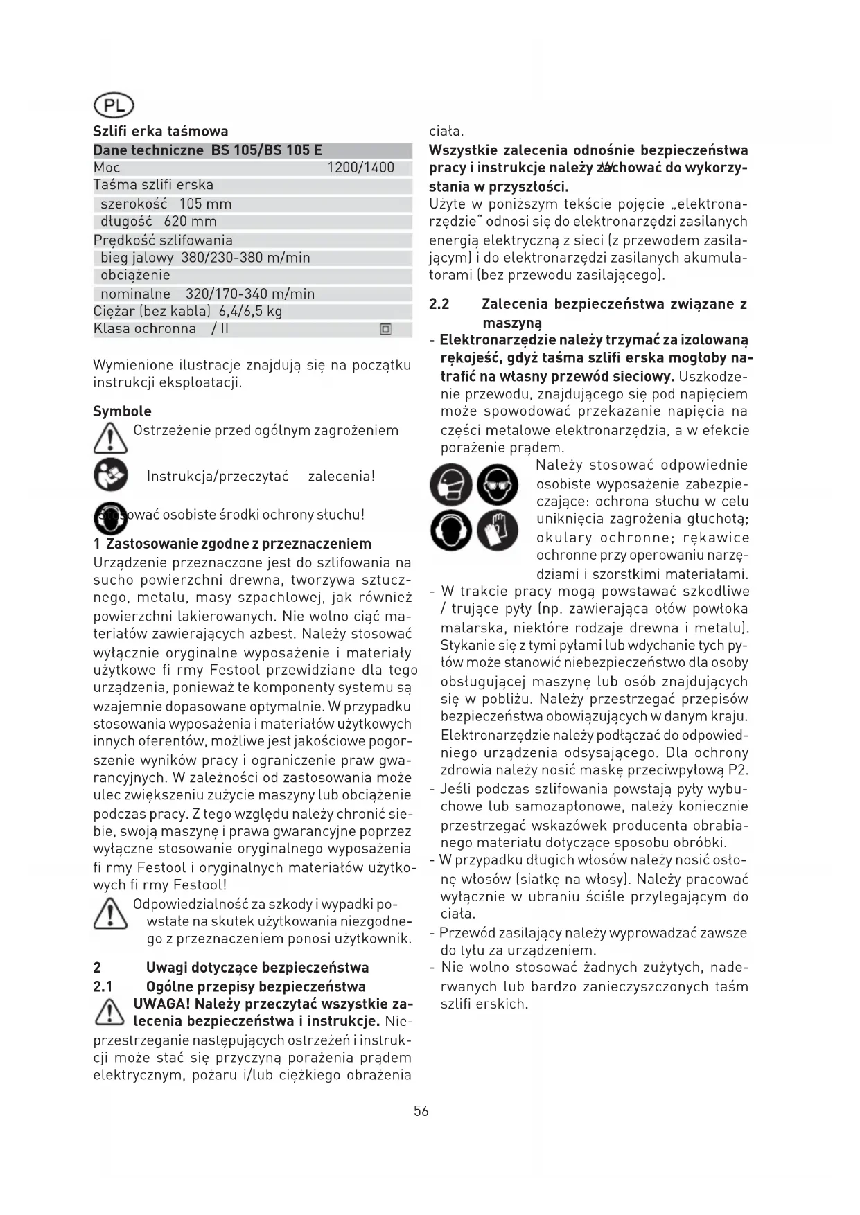 Používejte jen originální náhradní díly Festool! Obj. č. na: www.festool.com/ Service K zajištění cirkulace vzduchu, musejí být chladicí otvory vzduchu v krytu motoru vždy volné a udr- žované v čistotě. Přístroj je vybaven samovypínacími specielními uhlíky. Pokud se opotřebují, dojde k automatické- mu přerušení proudu a přístroj se zastaví. Když je opotřebovaná grafi tová vrstva, je nutno vyměnit brusnou podložku (3.4). Povolte za tímto účelem tři šrouby (3.2) a sejměte přítlačnou lištu (3.3). 7 Příslušenství, nástroje Objednací čísla níže popsaného příslušenství vy- hledejte, prosím, ve svém katalogu Festool nebo na internetu pod “www.festool.com”. Brusná podložka Pro hrubé broušení s velkým úběrem lze obdržet brusnou podložku. Brusné pásy - Pásy brusné tkaniny X s pojivem ze syntetické pryskyřice: broušení dřeva, tvrdých dřevovlákni- tých desek, železa, ocelových plechů, barevných a lehkých kovů. - Kombinované brusné pásy: odstraňování nátěrů a zbytků betonu, broušení sádrových ploch.55 8 Likvidace Nevyhazujte elektrická nářadí do domovního odpadu! Nechte ekologicky zlikvidovat nářadí, příslušenství aobaly! Dodržujte přitom platné národní předpisy. Pouze EU: Podle evropské směrnice 2002/96/ES musí být stará elektrická zařízení tříděna apředána kekologické likvidaci. Informace k REACh: www.festool.com/reach56 Szlifi erka taśmowa Dane techniczne BS 105/BS 105 E Moc 1200/1400 W Taśma szlifi erska szerokość 105 mm długość 620 mm Prędkość szlifowania bieg jalowy 380/230-380 m/min obciążenie nominalne 320/170-340 m/min Ciężar (bez kabla) 6,4/6,5 kg Klasa ochronna / II Wymienione ilustracje znajdują się na początku instrukcji eksploatacji. Symbole Ostrzeżenie przed ogólnym zagrożeniem Instrukcja/przeczytać zalecenia! Stosować osobiste środki ochrony słuchu! 1 Zastosowanie zgodne z przeznaczeniem Urządzenie przeznaczone jest do szlifowania na sucho powierzchni drewna, tworzywa sztucz- nego, metalu, masy szpachlowej, jak również powierzchni lakierowanych. Nie wolno ciąć ma- teriałów zawierających azbest. Należy stosować wyłącznie oryginalne wyposażenie i materiały użytkowe fi rmy Festool przewidziane dla tego urządzenia, ponieważ te komponenty systemu są wzajemnie dopasowane optymalnie. W przypadku stosowania wyposażenia i materiałów użytkowych innych oferentów, możliwe jest jakościowe pogor- szenie wyników pracy i ograniczenie praw gwa- rancyjnych. W zależności od zastosowania może ulec zwiększeniu zużycie maszyny lub obciążenie podczas pracy. Z tego względu należy chronić sie- bie, swoją maszynę i prawa gwarancyjne poprzez wyłączne stosowanie oryginalnego wyposażenia fi rmy Festool i oryginalnych materiałów użytko- wych fi rmy Festool! Odpowiedzialność za szkody i wypadki po- wstałe na skutek użytkowania niezgodne- go z przeznaczeniem ponosi użytkownik. 2 Uwagi dotyczące bezpieczeństwa