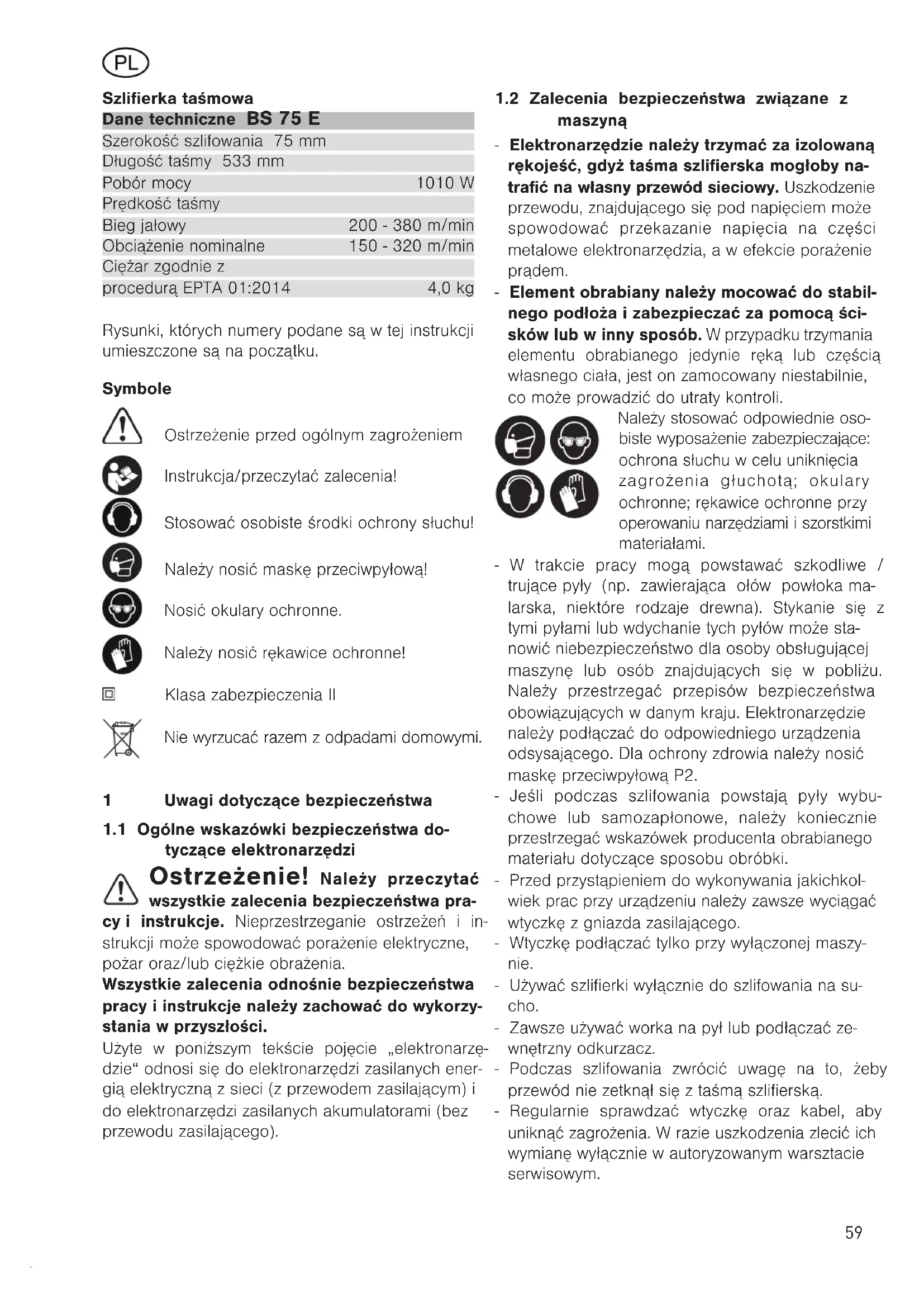 maszyną - Elektronarzędzie należy trzymać za izolowaną rękojeść, gdyż taśma szlifierska mogłoby na- trafić na własny przewód sieciowy. Uszkodzenie przewodu, znajdującego się pod napięciem może spowodować przekazanie napięcia na części metalowe elektronarzędzia, a w efekcie porażenie prądem. - Element obrabiany należy mocować do stabil- nego podłoża i zabezpieczać za pomocą ści- sków lub w inny sposób. W przypadku trzymania elementu obrabianego jedynie ręką lub częścią własnego ciała, jest on zamocowany niestabilnie, co może prowadzić do utraty kontroli. Należy stosować odpowiednie oso- biste wyposażenie zabezpieczające: ochrona słuchu w celu uniknięcia zagrożenia głuchotą; okulary ochronne; rękawice ochronne przy operowaniu narzędziami i szorstkimi materiałami. - W trakcie pracy mogą powstawać szkodliwe / trujące pyły (np. zawierająca ołów powłoka ma- larska, niektóre rodzaje drewna). Stykanie się z tymi pyłami lub wdychanie tych pyłów może sta- nowić niebezpieczeństwo dla osoby obsługującej maszynę lub osób znajdujących się w pobliżu. Należy przestrzegać przepisów bezpieczeństwa obowiązujących w danym kraju. Elektronarzędzie należy podłączać do odpowiedniego urządzenia odsysającego. Dla ochrony zdrowia należy nosić maskę przeciwpyłową P2. - Jeśli podczas szlifowania powstają pyły wybu- chowe lub samozapłonowe, należy koniecznie przestrzegać wskazówek producenta obrabianego materiału dotyczące sposobu obróbki. - Przed przystąpieniem do wykonywania jakichkol- wiek prac przy urządzeniu należy zawsze wyciągać wtyczkę z gniazda zasilającego. - Wtyczkę podłączać tylko przy wyłączonej maszy- nie. - Używać szlifierki wyłącznie do szlifowania na su- cho. - Zawsze używać worka na pył lub podłączać ze- wnętrzny odkurzacz. - Podczas szlifowania zwrócić uwagę na to, żeby przewód nie zetknął się z taśmą szlifierską. - Regularnie sprawdzać wtyczkę oraz kabel, aby uniknąć zagrożenia. W razie uszkodzenia zlecić ich wymianę wyłącznie w autoryzowanym warsztacie serwisowym. Szlifierka taśmowa Dane techniczne BS 75 E Szerokoœæ szlifowania 75 mm D³ugoœæ taœmy 533 mm Pobór mocy 1010 W Prêdkoœæ taœmy Bieg ja³owy 200 - 380 m/min Obci¹¿enie nominalne 150 - 320 m/min Ciężar zgodnie z procedurą EPTA 01:2014 4,0 kg Rysunki, których numery podane s¹ w tej instrukcji umieszczone s¹ na pocz¹tku. Symbole Ostrzeżenie przed ogólnym zagrożeniem Instrukcja/przeczytać zalecenia! Stosowaæ osobiste œrodki ochrony s³uchu! Należy nosić maskę przeciwpyłową! Nosić okulary ochronne. Należy nosić rękawice ochronne! Klasa zabezpieczenia II Nie wyrzucać razem z odpadami domowymi. 1 Uwagi dotyczące bezpieczeństwa