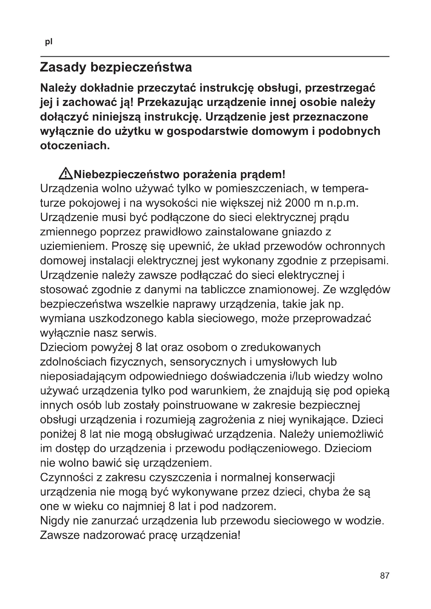 Zasady bezpieczeństwa Należy dokładnie przeczytać instrukcję obsługi, przestrzegać jej i zachować ją! Przekazując urządzenie innej osobie należy dołączyć niniejszą instrukcję. Urządzenie jest przeznaczone wyłącznie do użytku w gospodarstwie domowym i podobnych otoczeniach. WNiebezpieczeństwo porażenia prądem! Urządzenia wolno używać tylko w pomieszczeniach, w tempera turze pokojowej i na wysokości nie większej niż 2000 m n.p.m. Urządzenie musi być podłączone do sieci elektrycznej prądu zmiennego poprzez prawidłowo zainstalowane gniazdo z uziemieniem. Proszę się upewnić, że układ przewodów ochronnych domowej instalacji elektrycznej jest wykonany zgodnie z przepisami. Urządzenie należy zawsze podłączać do sieci elektrycznej i stosować zgodnie z danymi na tabliczce znamionowej. Ze względów bezpieczeństwa wszelkie naprawy urządzenia, takie jak np. wymiana uszkodzonego kabla sieciowego, może przeprowadzać wyłącznie nasz serwis. Dzieciom powyżej 8 lat oraz osobom o zredukowanych zdolnościach zycznych, sensorycznych i umysłowych lub nieposiadającym odpowiedniego doświadczenia i/lub wiedzy wolno używać urządzenia tylko pod warunkiem, że znajdują się pod opieką innych osób lub zostały poinstruowane w zakresie bezpiecznej obsługi urządzenia i rozumieją zagrożenia z niej wynikające. Dzieci poniżej 8 lat nie mogą obsługiwać urządzenia. Należy uniemożliwić im dostęp do urządzenia i przewodu podłączeniowego. Dzieciom nie wolno bawić się urządzeniem. Czynności z zakresu czyszczenia i normalnej konserwacji urządzenia nie mogą być wykonywane przez dzieci, chyba że są one w wieku co najmniej 8 lat i pod nadzorem. Nigdy nie zanurzać urządzenia lub przewodu sieciowego w wodzie. Zawsze nadzorować pracę urządzenia!88