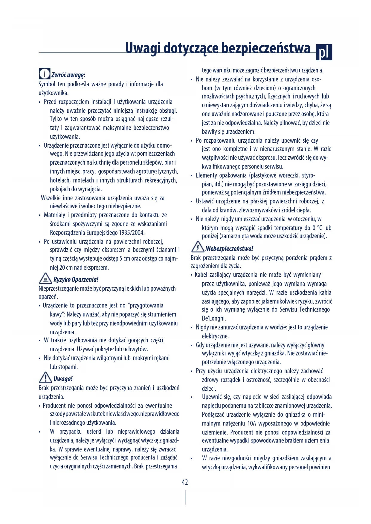 - Kabel zasilający urządzenia nie może być wymieniany przez użytkownika, ponieważ jego wymiana wymaga użycia specjalnych narzędzi. W razie uszkodzenia kabla zasilającego, aby zapobiec jakiemukolwiek ryzyku, zwrócić się o ich wymianę wyłącznie do Serwisu Technicznego De’Longhi.