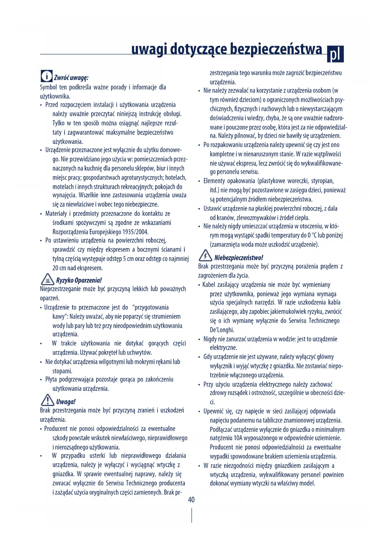 - Kabel zasilający urządzenia nie może być wymieniany przez użytkownika, ponieważ jego wymiana wymaga użycia specjalnych narzędzi. W razie uszkodzenia kabla zasilającego, aby zapobiec jakiemukolwiek ryzyku, zwrócić się o ich wymianę wyłącznie do Serwisu Technicznego De’Longhi.