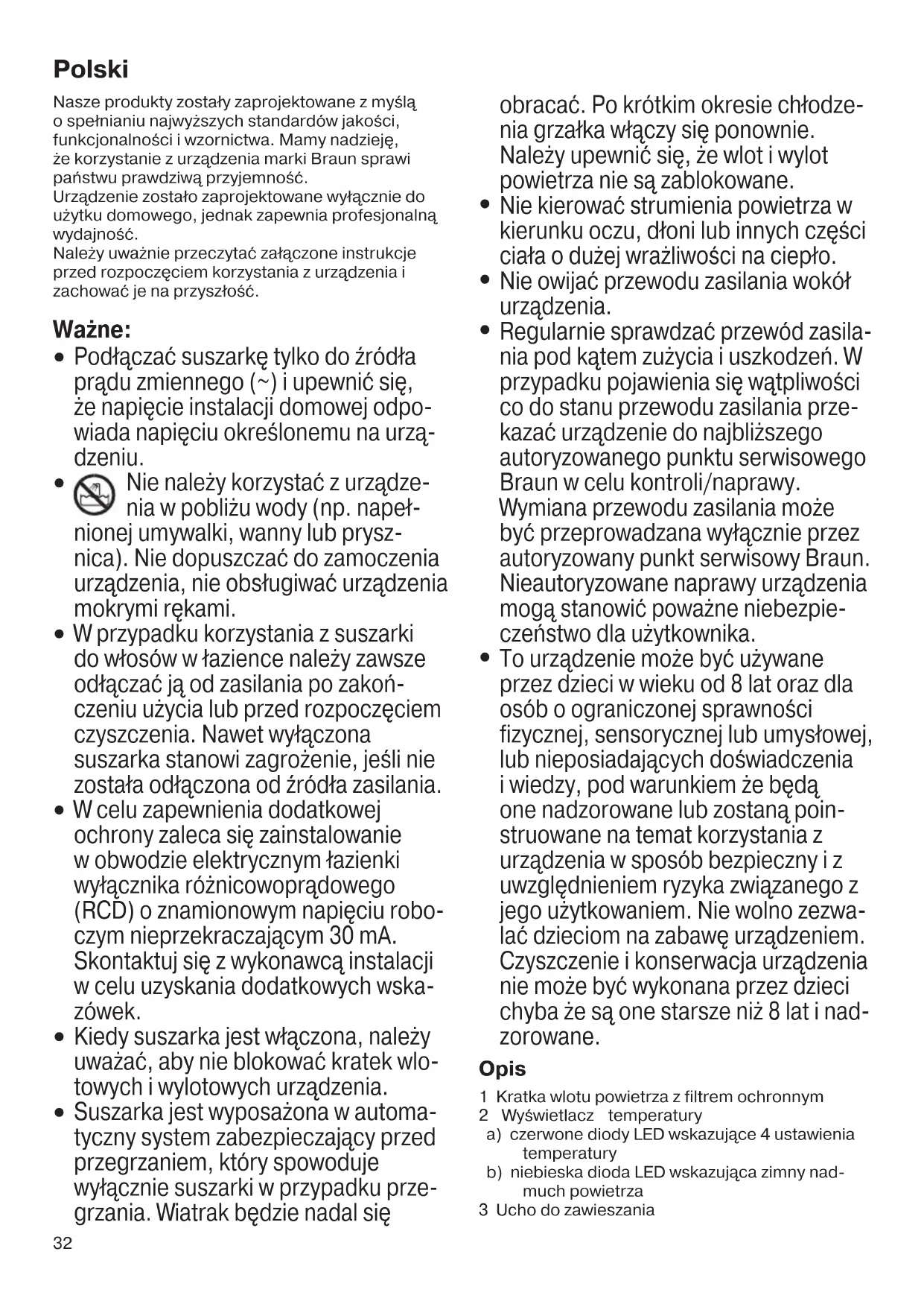 Regularnie sprawdzać przewód zasila- nia pod kątem zużycia i uszkodzeń. W przypadku pojawienia się wątpliwości co do stanu przewodu zasilania prze- kazać urządzenie do najbliższego autoryzowanego punktu serwisowego Braun w celu kontroli/naprawy. Wymiana przewodu zasilania może być przeprowadzana wyłącznie przez autoryzowany punkt serwisowy Braun. Nieautoryzowane naprawy urządzenia mogą stanowić poważne niebezpie- czeństwo dla użytkownika.