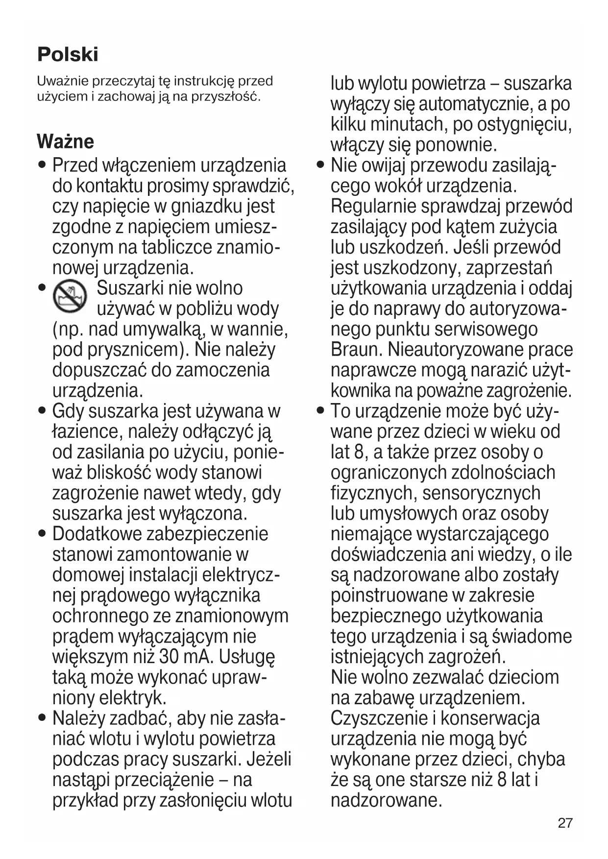 Gdy suszarka jest używana w łazience, należy odłączyć ją od zasilania po użyciu, ponie- waż bliskość wody stanowi zagrożenie nawet wtedy, gdy suszarka jest wyłączona.