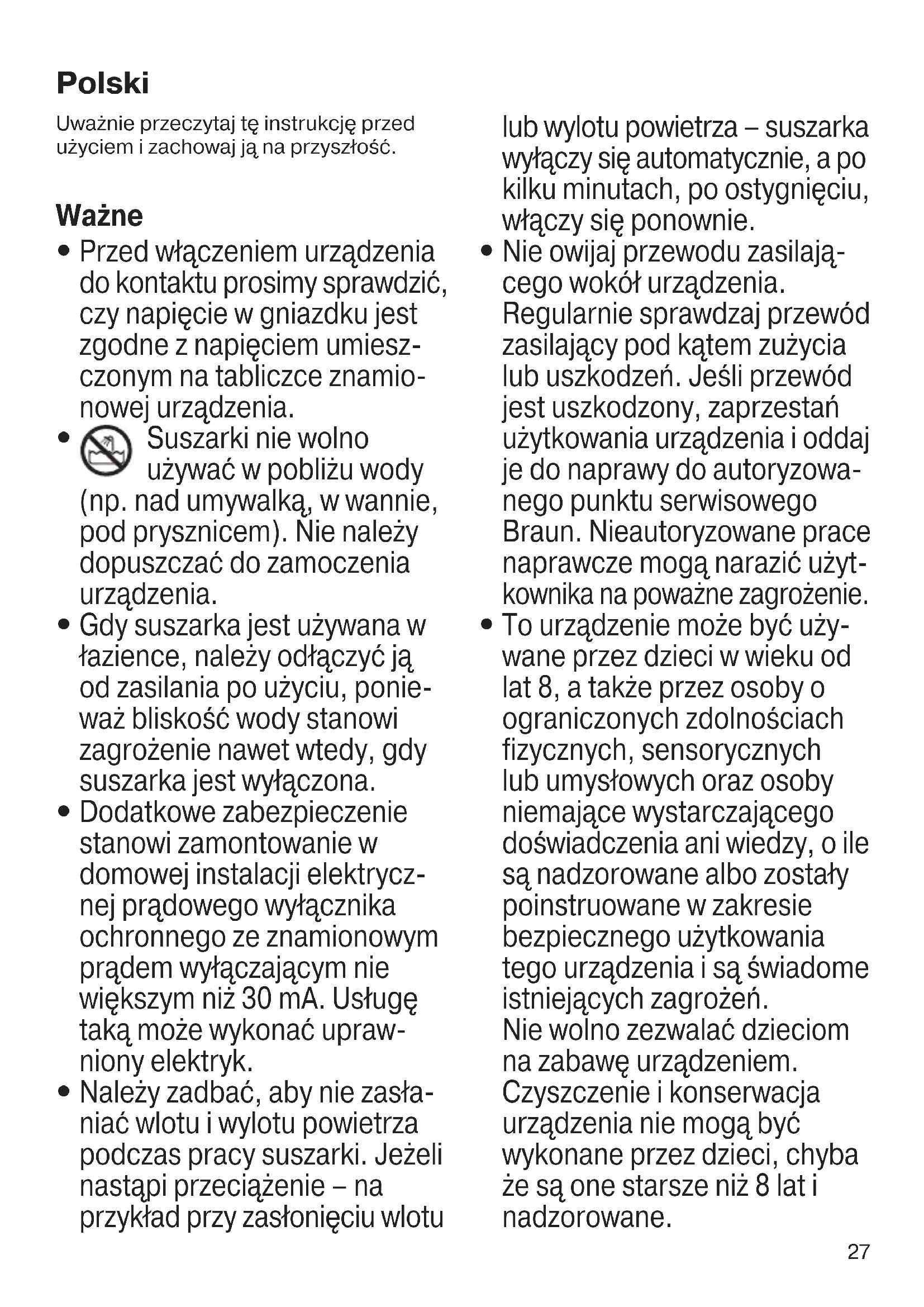 Gdy suszarka jest używana w łazience, należy odłączyć ją od zasilania po użyciu, ponie- waż bliskość wody stanowi zagrożenie nawet wtedy, gdy suszarka jest wyłączona.