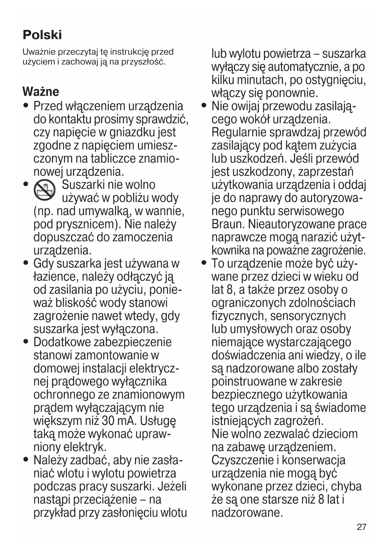 Suszarki nie wolno używać w pobliżu wody (np. nad umywalką, w wannie, pod prysznicem). Nie należy dopuszczać do zamoczenia urządzenia.