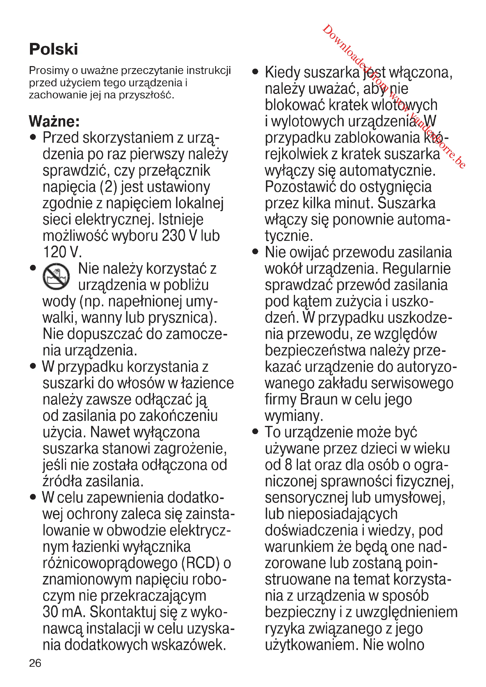 Nie owijać przewodu zasilania wokół urządzenia. Regularnie sprawdzać przewód zasilania pod kątem zużycia i uszko- dzeń. W przypadku uszkodze- nia przewodu, ze względów bezpieczeństwa należy prze- kazać urządzenie do autoryzo- wanego zakładu serwisowego firmy Braun w celu jego wymiany.