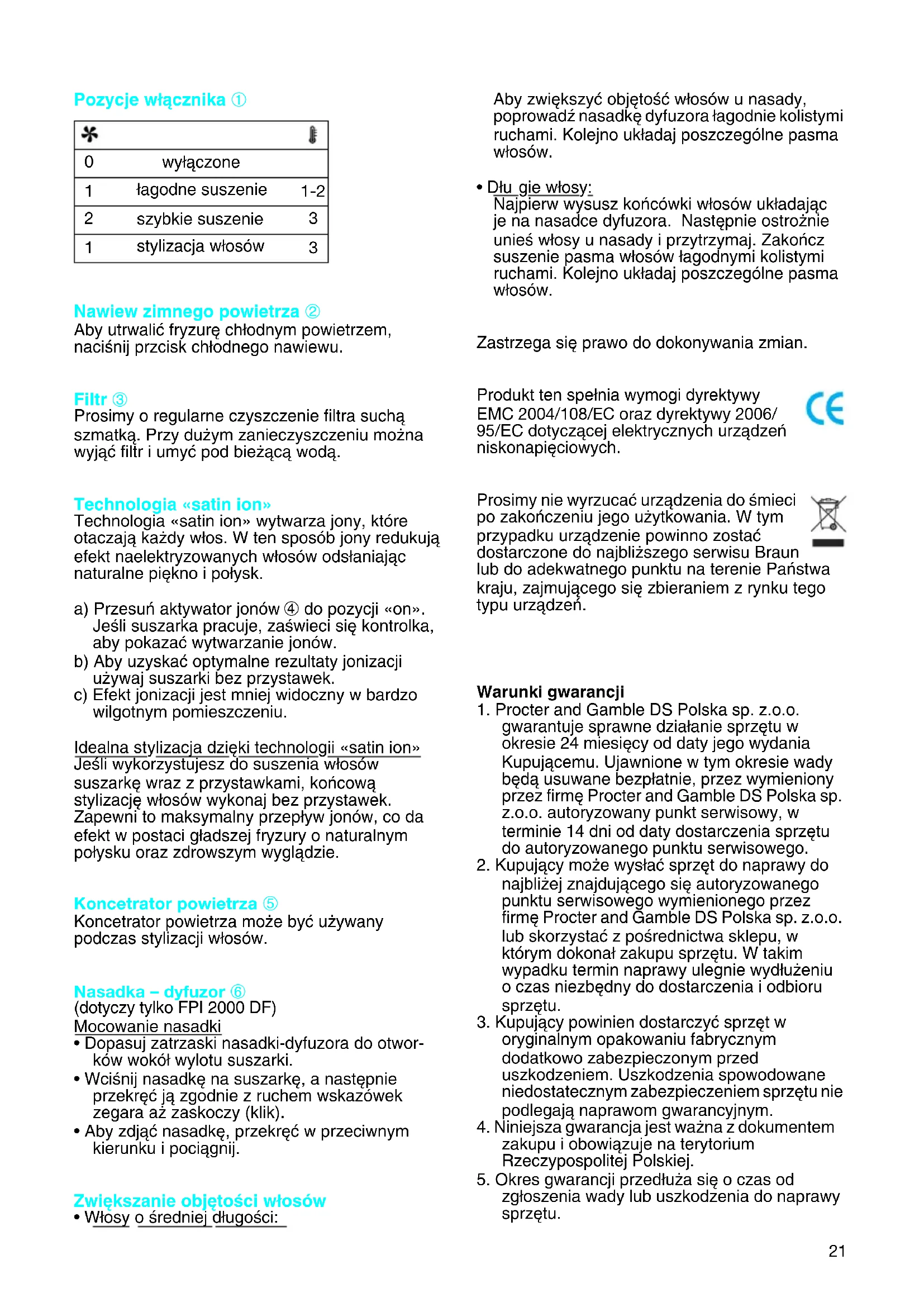 - D∏u gie w∏osy: Najpierw wysusz koƒcówki w∏osów uk∏adajàc je na nasadce dyfuzora. Nast´pnie ostro˝nie unieÊ w∏osy u nasady i przytrzymaj. Zakoƒcz suszenie pasma w∏osów ∏agodnymi kolistymi ruchami. Kolejno uk∏adaj poszczególne pasma w∏osów. Zastrzega si´ prawo do dokonywania zmian. Produkt ten spe∏nia wymogi dyrektywy EMC 2004/108/EC oraz dyrektywy 2006/ 95/EC dotyczàcej elektrycznych urzàdzeƒ niskonapi´ciowych. Prosimy nie wyrzucaç urzàdzenia do Êmieci po zakoƒczeniu jego u˝ytkowania. W tym przypadku urzàdzenie powinno zostaç dostarczone do najbli˝szego serwisu Braun lub do adekwatnego punktu na terenie Paƒstwa kraju, zajmujàcego si´ zbieraniem z rynku tego typu urzàdzeƒ. Warunki gwarancji