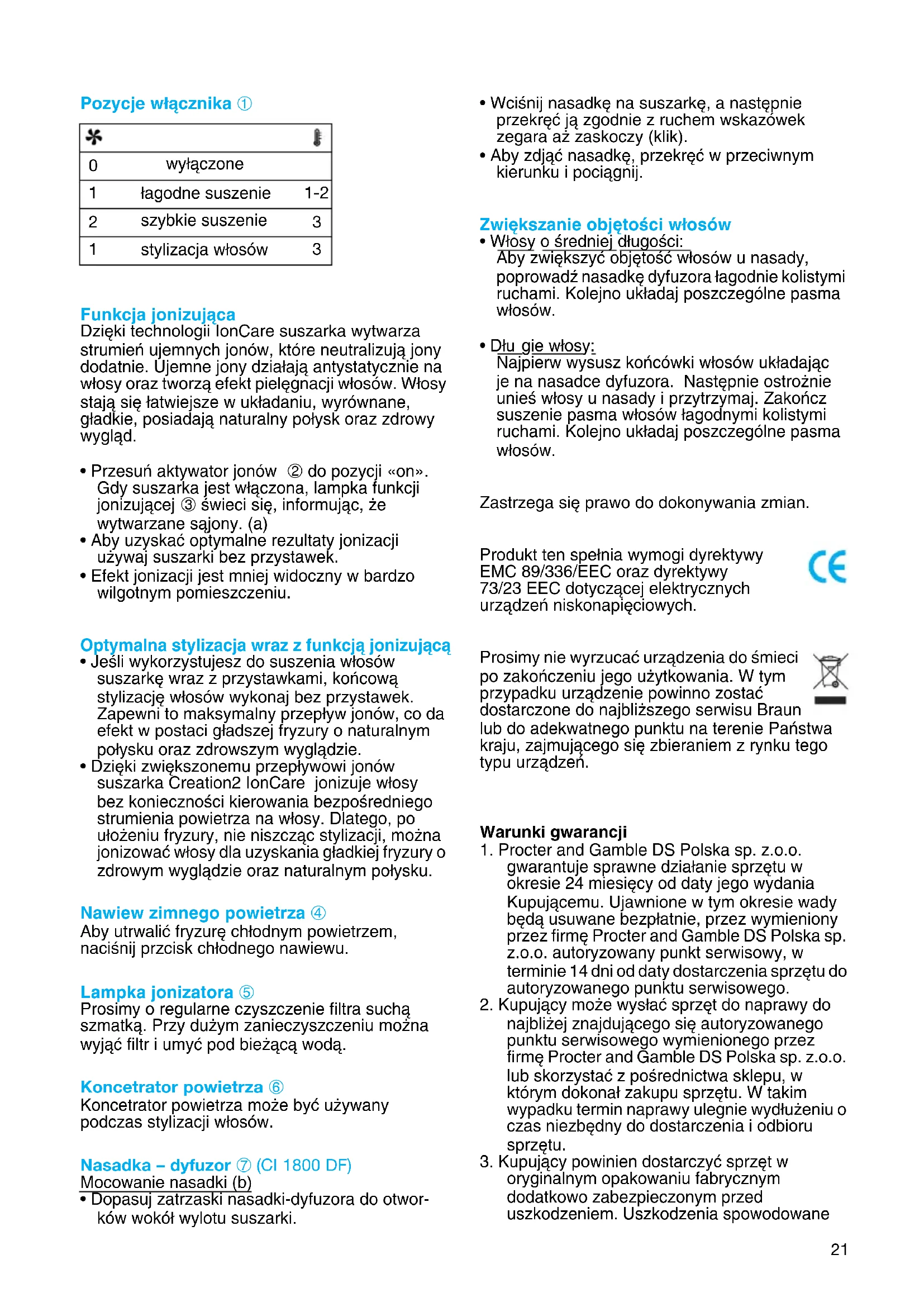 - D∏u gie w∏osy: Najpierw wysusz koƒcówki w∏osów uk∏adajàc je na nasadce dyfuzora. Nast´pnie ostro˝nie unieÊ w∏osy u nasady i przytrzymaj. Zakoƒcz suszenie pasma w∏osów ∏agodnymi kolistymi ruchami. Kolejno uk∏adaj poszczególne pasma w∏osów. Zastrzega si´ prawo do dokonywania zmian. Produkt ten spe∏nia wymogi dyrektywy EMC 89/336/EEC oraz dyrektywy 73/23 EEC dotyczàcej elektrycznych urzàdzeƒ niskonapi´ciowych. Prosimy nie wyrzucaç urzàdzenia do Êmieci po zakoƒczeniu jego u˝ytkowania. W tym przypadku urzàdzenie powinno zostaç dostarczone do najbli˝szego serwisu Braun lub do adekwatnego punktu na terenie Paƒstwa kraju, zajmujàcego si´ zbieraniem z rynku tego typu urzàdzeƒ. Warunki gwarancji