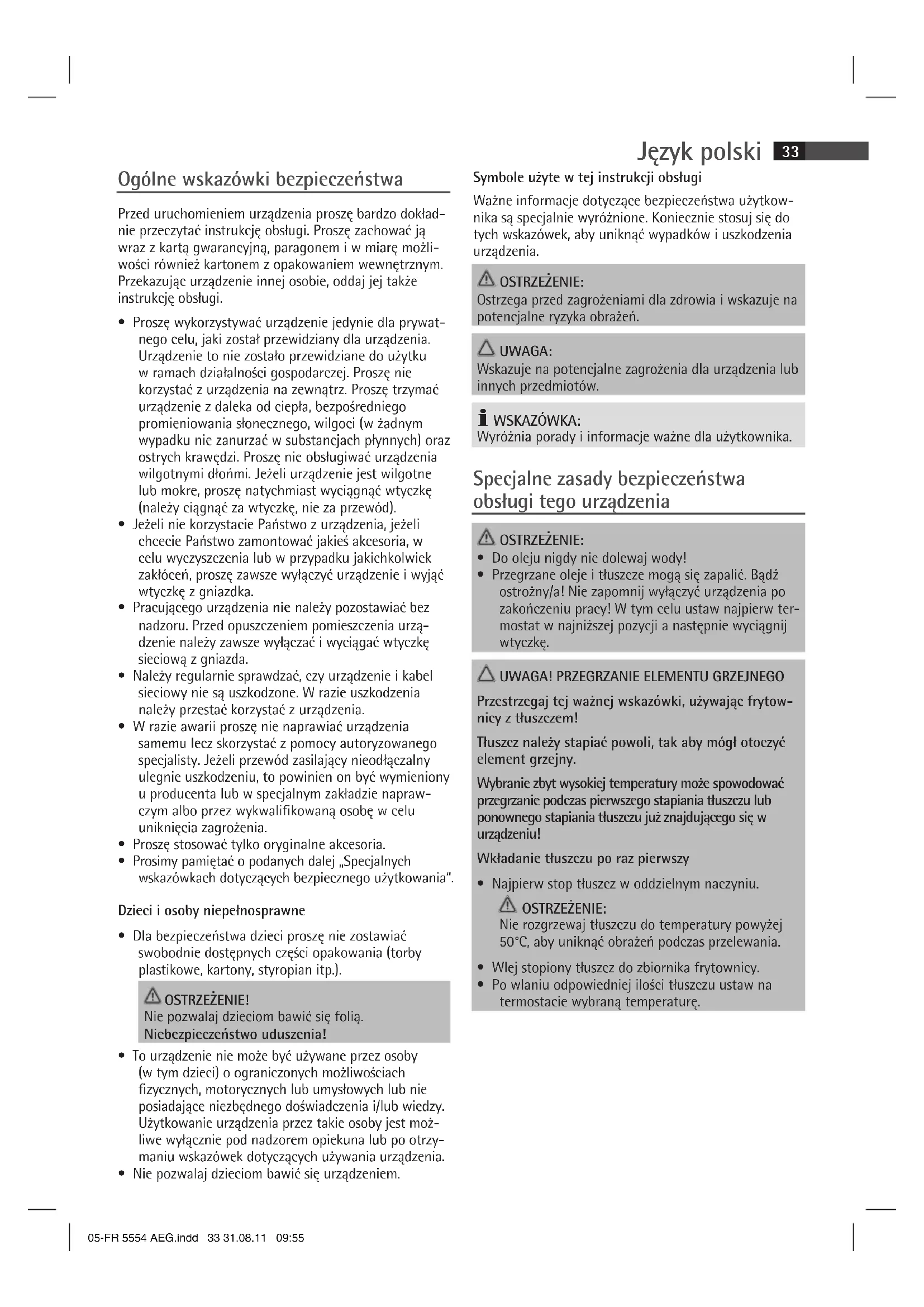 - Po wlaniu odpowiedniej ilości tłuszczu ustaw na termostacie wybraną temperaturę. 05-FR 5554 AEG.indd 33 31.08.11 09:55Język polski