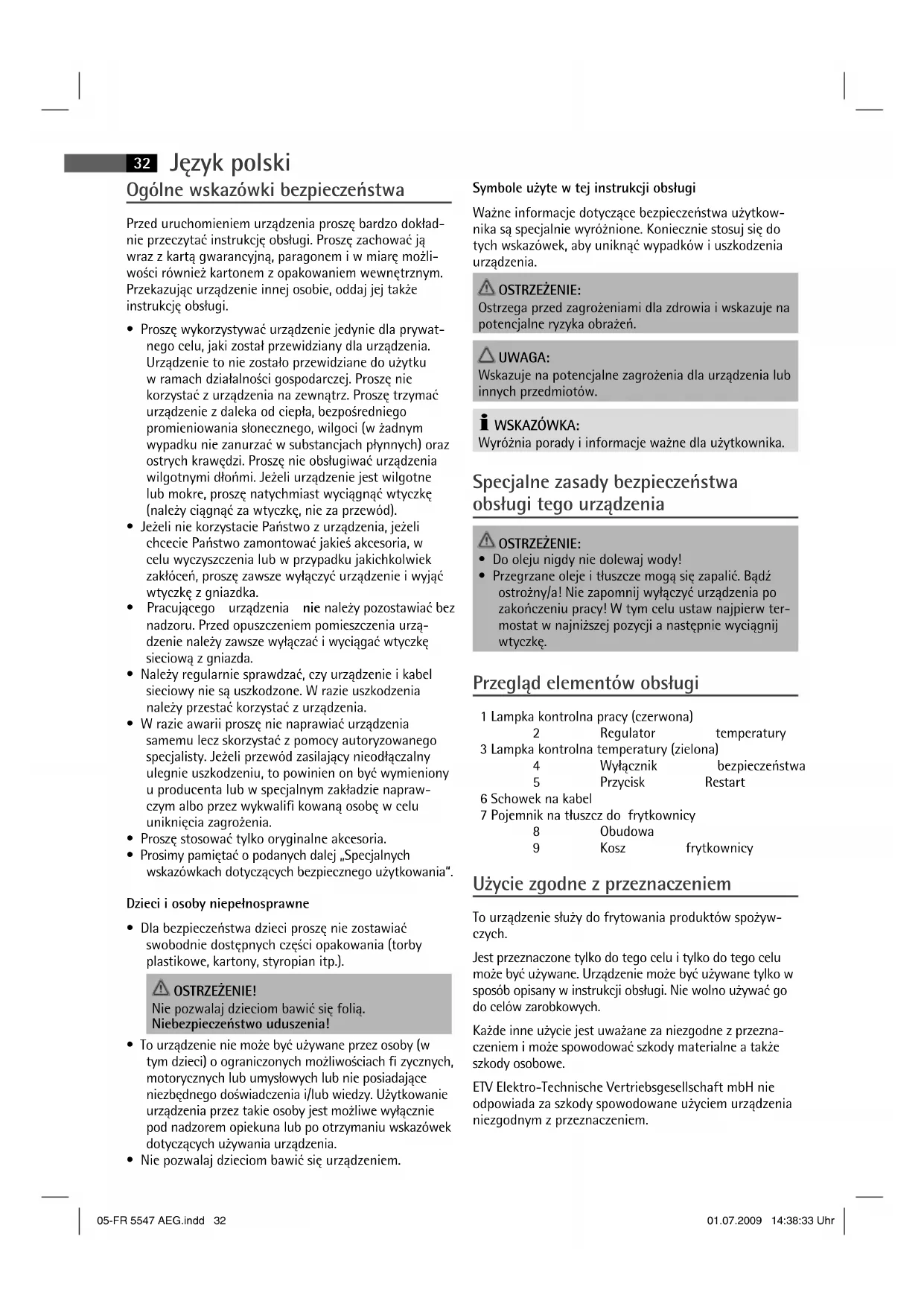 - Przegrzane oleje i tłuszcze mogą się zapalić. Bądź ostrożny/a! Nie zapomnij wyłączyć urządzenia po zakończeniu pracy! W tym celu ustaw najpierw ter- mostat w najniższej pozycji a następnie wyciągnij wtyczkę. Przegląd elementów obsługi 1 Lampka kontrolna pracy (czerwona) 2 Regulator temperatury 3 Lampka kontrolna temperatury (zielona) 4 Wyłącznik bezpieczeństwa 5 Przycisk Restart 6 Schowek na kabel 7 Pojemnik na tłuszcz do frytkownicy 8 Obudowa 9 Kosz frytkownicy Użycie zgodne z przeznaczeniem To urządzenie służy do frytowania produktów spożyw- czych. Jest przeznaczone tylko do tego celu i tylko do tego celu może być używane. Urządzenie może być używane tylko w sposób opisany w instrukcji obsługi. Nie wolno używać go do celów zarobkowych. Każde inne użycie jest uważane za niezgodne z przezna- czeniem i może spowodować szkody materialne a także szkody osobowe. ETV Elektro-Technische Vertriebsgesellschaft mbH nie odpowiada za szkody spowodowane użyciem urządzenia niezgodnym z przeznaczeniem. 05-FR 5547 AEG.indd 3205-FR 5547 AEG.indd 32 01.07.2009 14:38:33 Uhr01.07.2009 14:38:33 UhrJęzyk polski