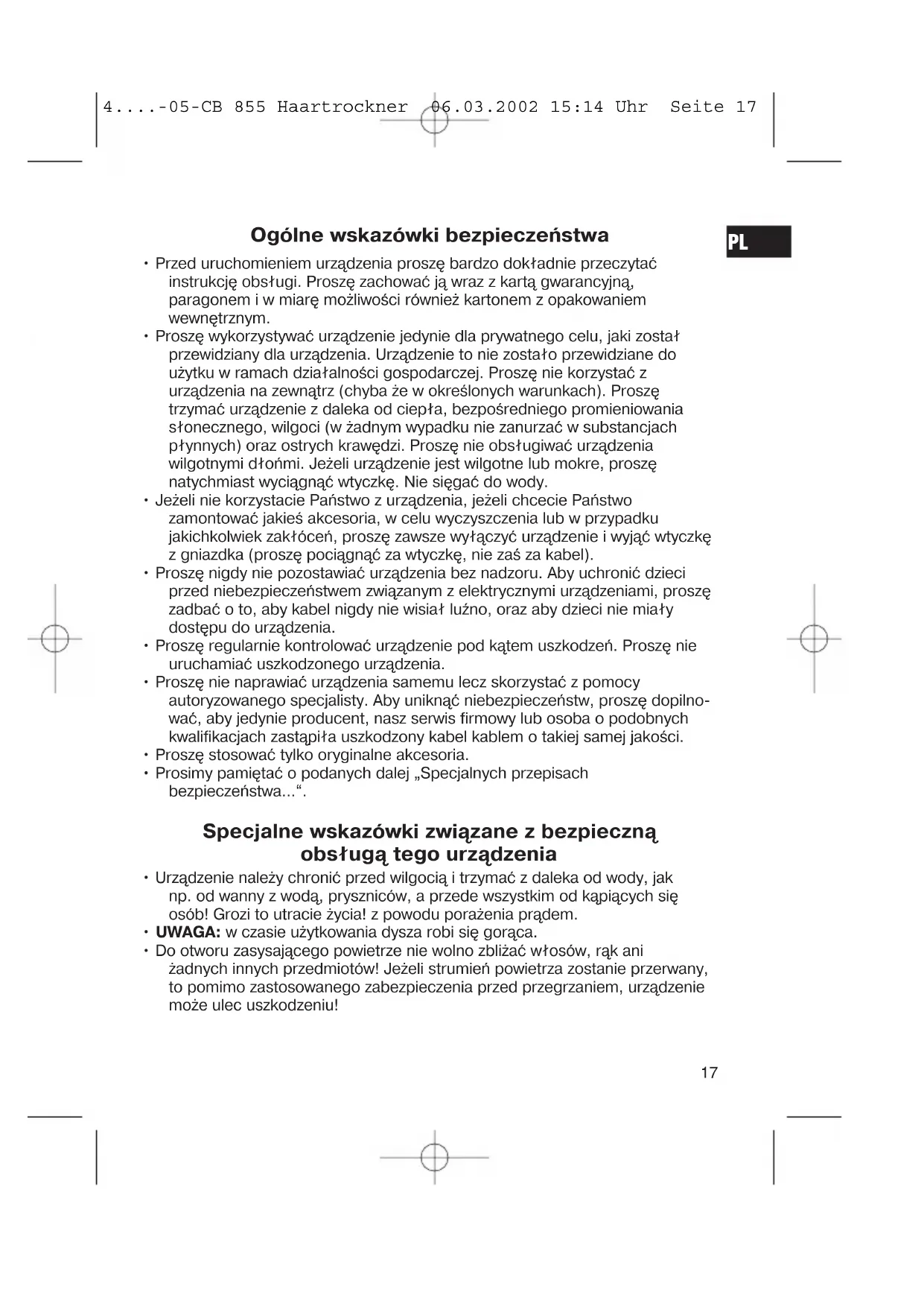 4....-05-CB 855 Haartrockner 06.03.2002 15:14 Uhr Seite 16Ogólne wskazówki bezpieczeństwa