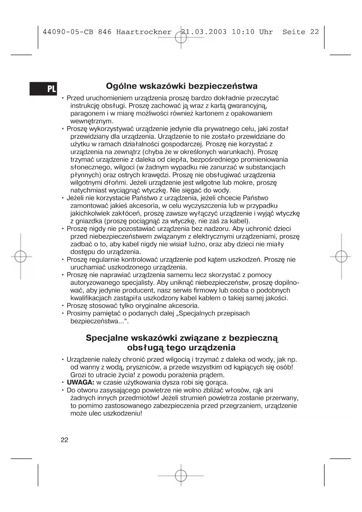 44090-05-CB 846 Haartrockner 21.03.2003 10:10 Uhr Seite 21Ogólne wskazówki bezpieczeństwa