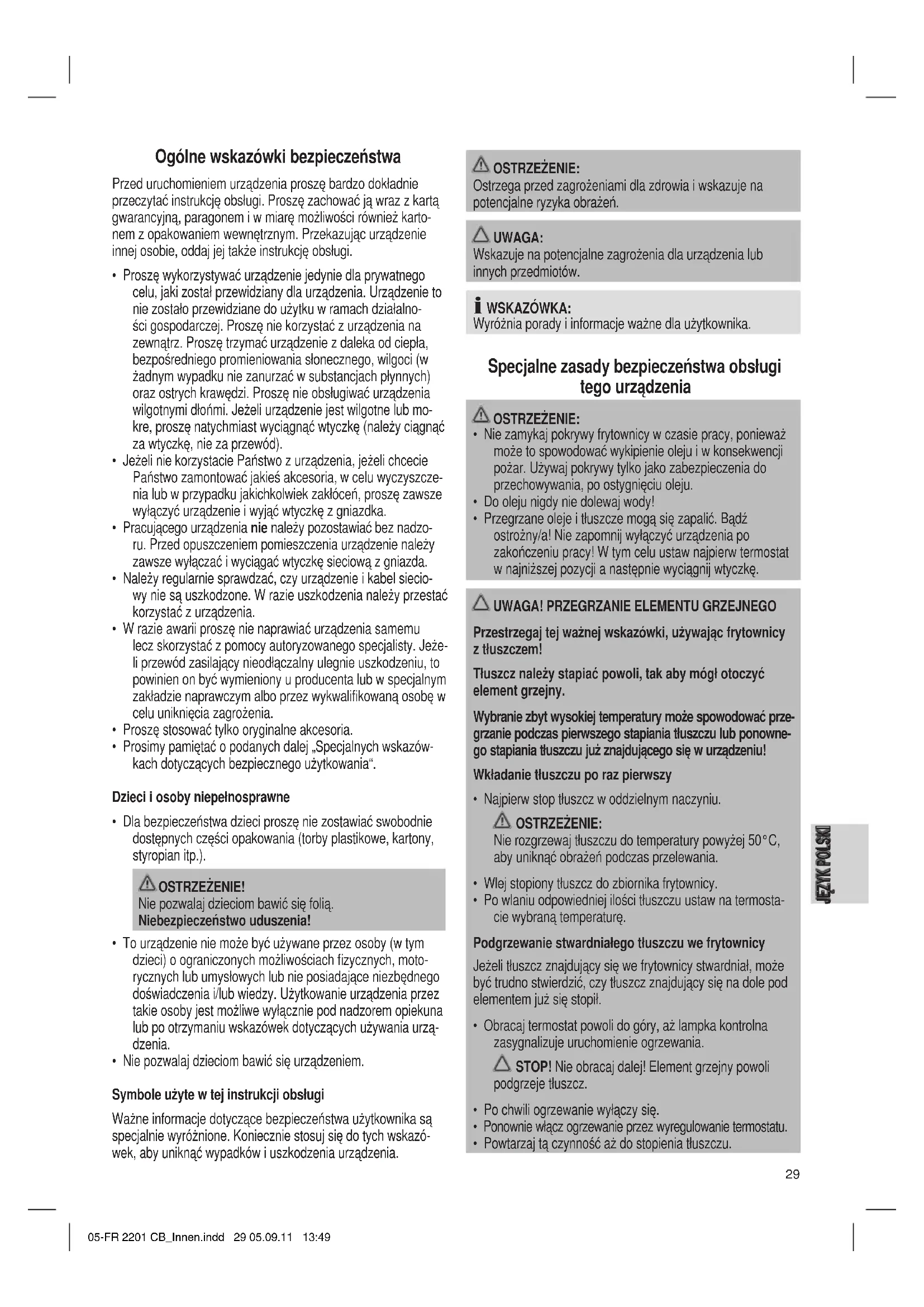do sucha ściereczką. UWAGA: w przypadku środków spożywczych zawierających dużo wilgoci (np.: silnie zamrożone frytki itd.) powstaje intensywnie piana, z powodu czego w najniekorzystniejszym razie olej może się przelać. Użytkowanie