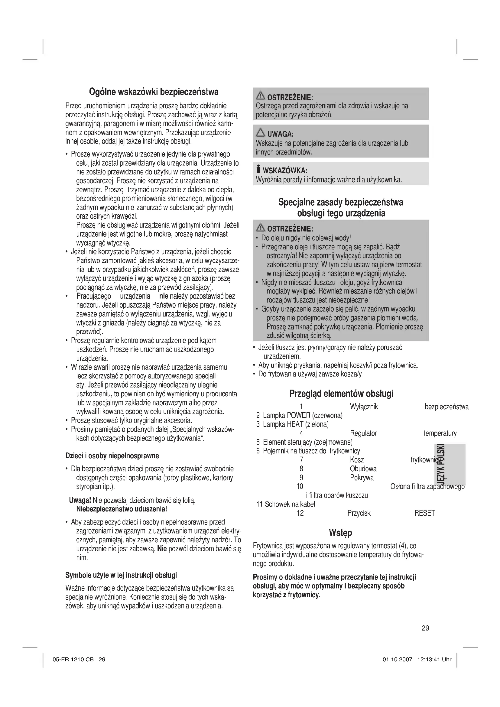 - Do frytowania używaj zawsze kosza/y. Przegląd elementów obsługi 1 Wyłącznik bezpieczeństwa 2 Lampka POWER (czerwona) 3 Lampka HEAT (zielona) 4 Regulator temperatury 5 Element sterujący (zdejmowane) 6 Pojemnik na tłuszcz do frytkownicy 7 Kosz frytkownicy 8 Obudowa 9 Pokrywa 10 Osłona fi ltra zapachowego i fi ltra oparów tłuszczu 11 Schowek na kabel 12 Przycisk RESET Wstęp Frytownica jest wyposażona w regulowany termostat (4), co umożliwia indywidualne dostosowanie temperatury do frytowa- nego produktu. Prosimy o dokładne i uważne przeczytanie tej instrukcji obsługi, aby móc w optymalny i bezpieczny sposób korzystać z frytownicy. 05-FR 1210 CB 2905-FR 1210 CB 29 01.10.2007 12:13:41 Uhr01.10.2007 12:13:41 Uhr30