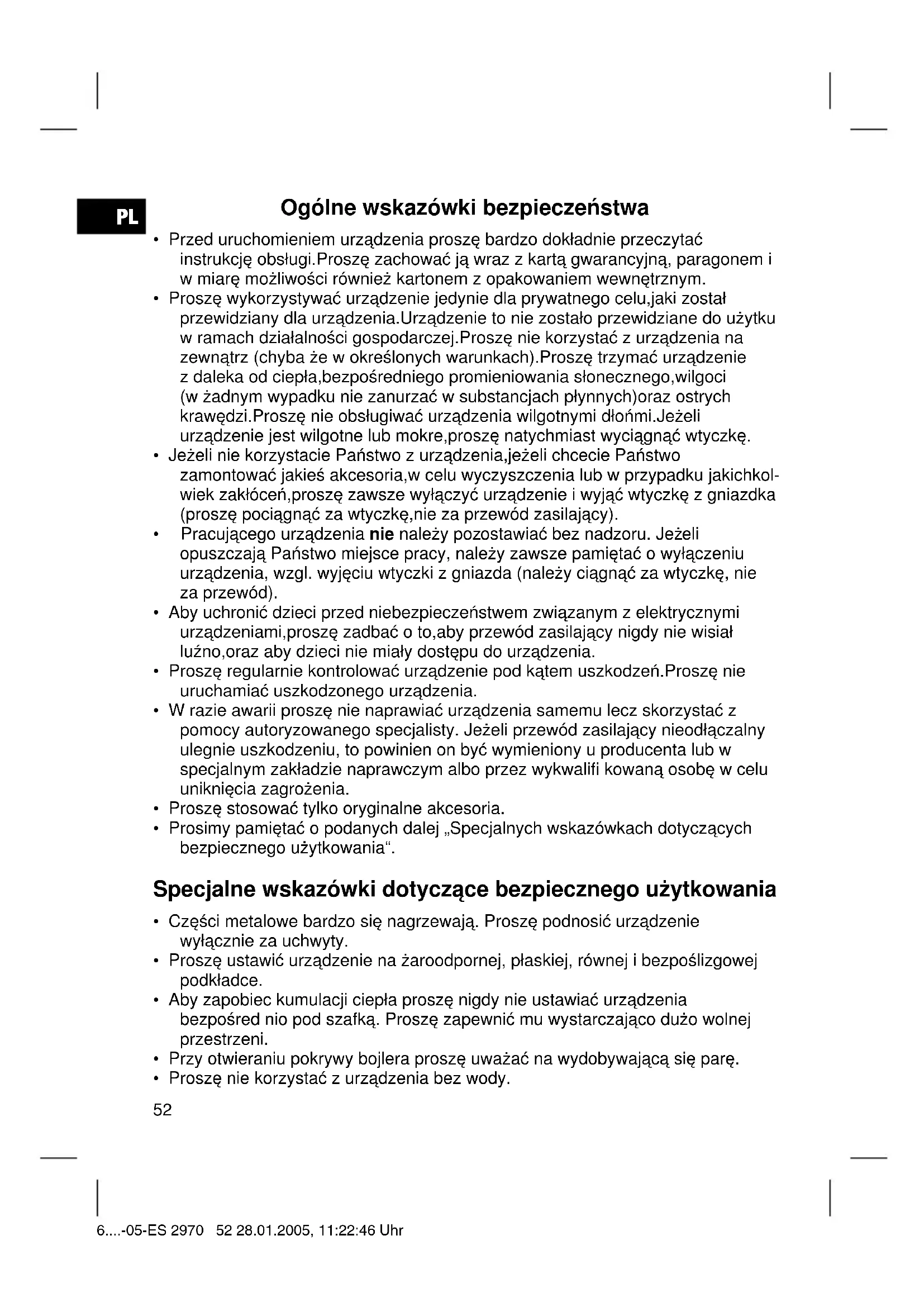 - Proszę nie korzystać z urządzenia bez wody. 6....-05-ES 2970 52 28.01.2005, 11:22:46 UhrPL