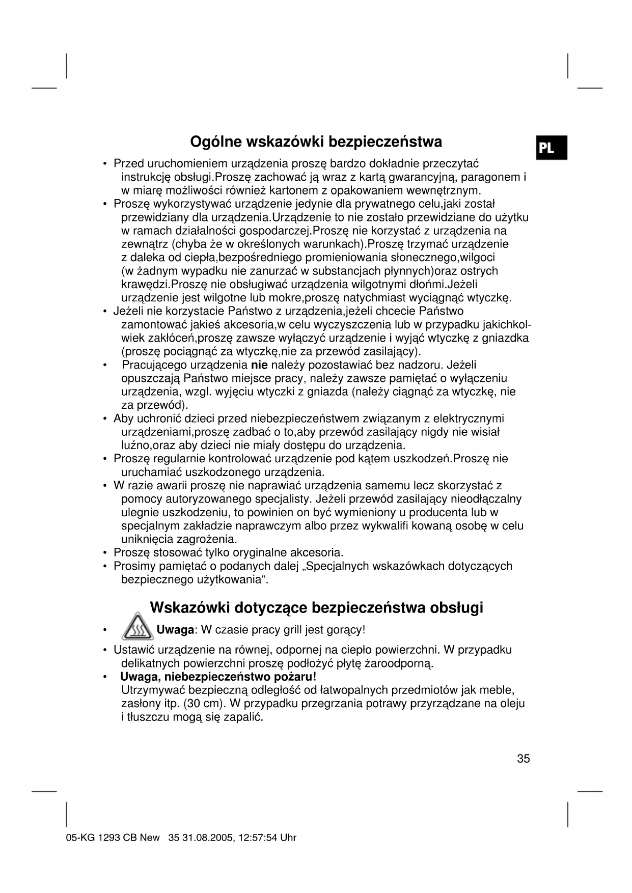- Uwaga, niebezpieczeństwo pożaru! Utrzymywać bezpieczną odległość od łatwopalnych przedmiotów jak meble, zasłony itp. (30 cm). W przypadku przegrzania potrawy przyrządzane na oleju i tłuszczu mogą się zapalić. 05-KG 1293 CB New 35 31.08.2005, 12:57:54 UhrPL