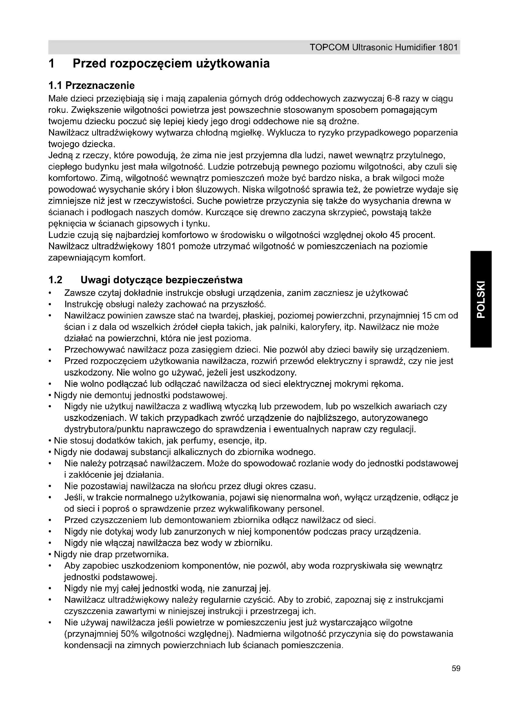 - Nie używaj nawilżacza jeśli powietrze w pomieszczeniu jest już wystarczająco wilgotne (przynajmniej 50% wilgotności względnej). Nadmierna wilgotność przyczynia się do powstawania kondensacji na zimnych powierzchniach lub ścianach pomieszczenia. HL_Ultrasonic Humidifier 1801 D106.book Page 59 Sunday, May 29, 2011 7:33 PM60 TOPCOM Ultrasonic Humidifier 1801 2 Specyfikacje techniczne – Wydajność nawilżania: 300ml/h – Objętość zbiornika wody: 6 l – Napięcie znamionowe: 230 V AC – Częstotliwość znamionowa: 50Hz – Moc znamionowa: 50 W – Zabezpieczenie przed porażeniem elektrycznym: II kat. 3Opis a. Uchwyt b. Pokrywka wlotu wody c. Czujnik niskiego poziomu wody d. Przewód zasilania e. Blok przycisków f. Wyświetlacz LCD g. Kanał wody h. Zbiornik wody