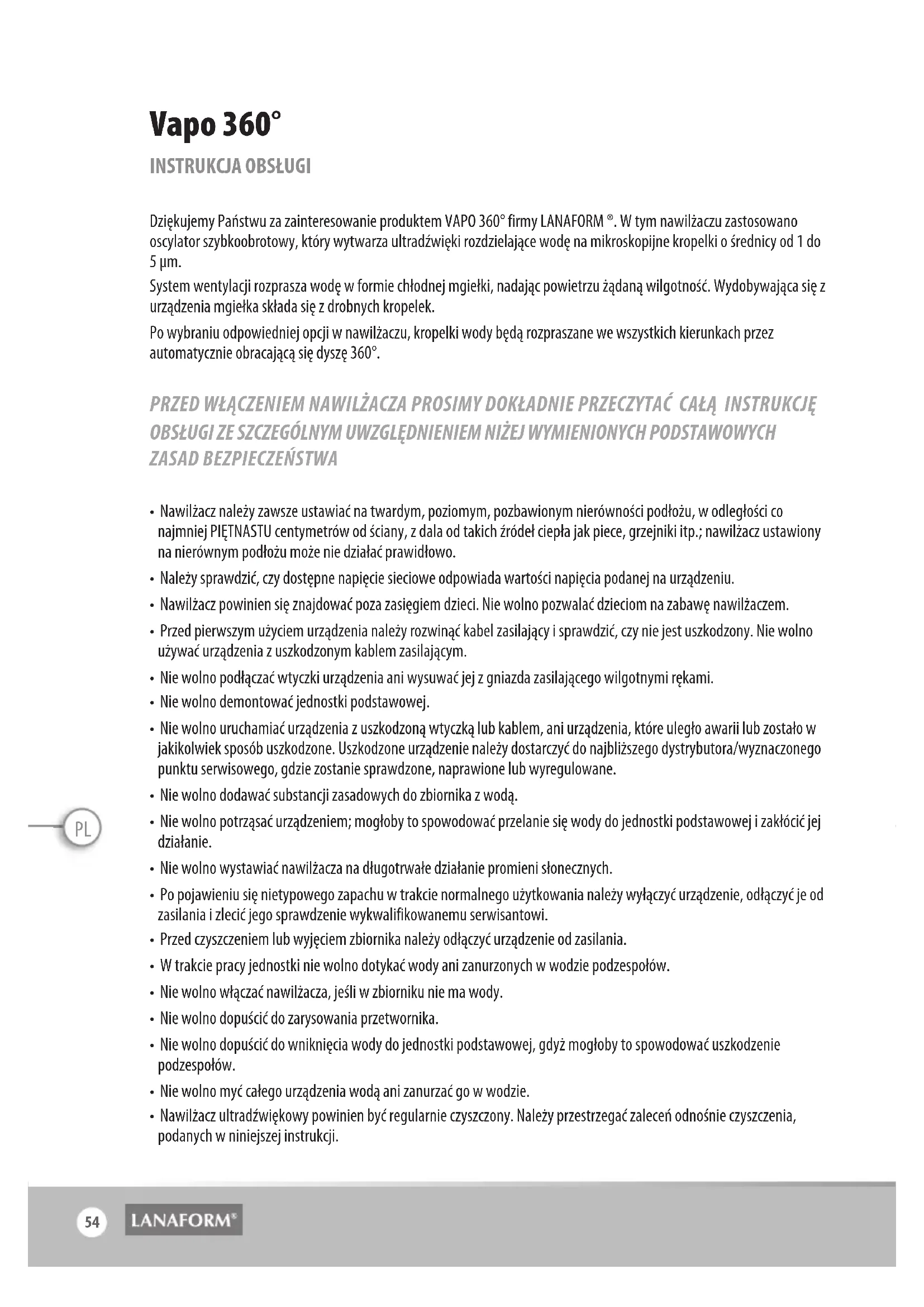 Dziękujemy Państwu za zainteresowanie produktem VAPO 360° firmy LANAFORM ®. W tym nawilżaczu zastosowano oscylator szybkoobrotowy, który wytwarza ultradźwięki rozdzielające wodę na mikroskopijne kropelki o średnicy od 1 do 5 µm. System wentylacji rozprasza wodę w formie chłodnej mgiełki, nadając powietrzu żądaną wilgotność. Wydobywająca się z urządzenia mgiełka składa się z drobnych kropelek. Po wybraniu odpowiedniej opcji w nawilżaczu, kropelki wody będą rozpraszane we wszystkich kierunkach przez automatycznie obracającą się dyszę 360°. PRZED WŁĄCZENIEM NAWILŻACZA PROSIMY DOKŁADNIE PRZECZYTAĆ CAŁĄ INSTRUKCJĘ OBSŁUGI ZE SZCZEGÓLNYM UWZGLĘDNIENIEM NIŻEJ WYMIENIONYCH PODSTAWOWYCH