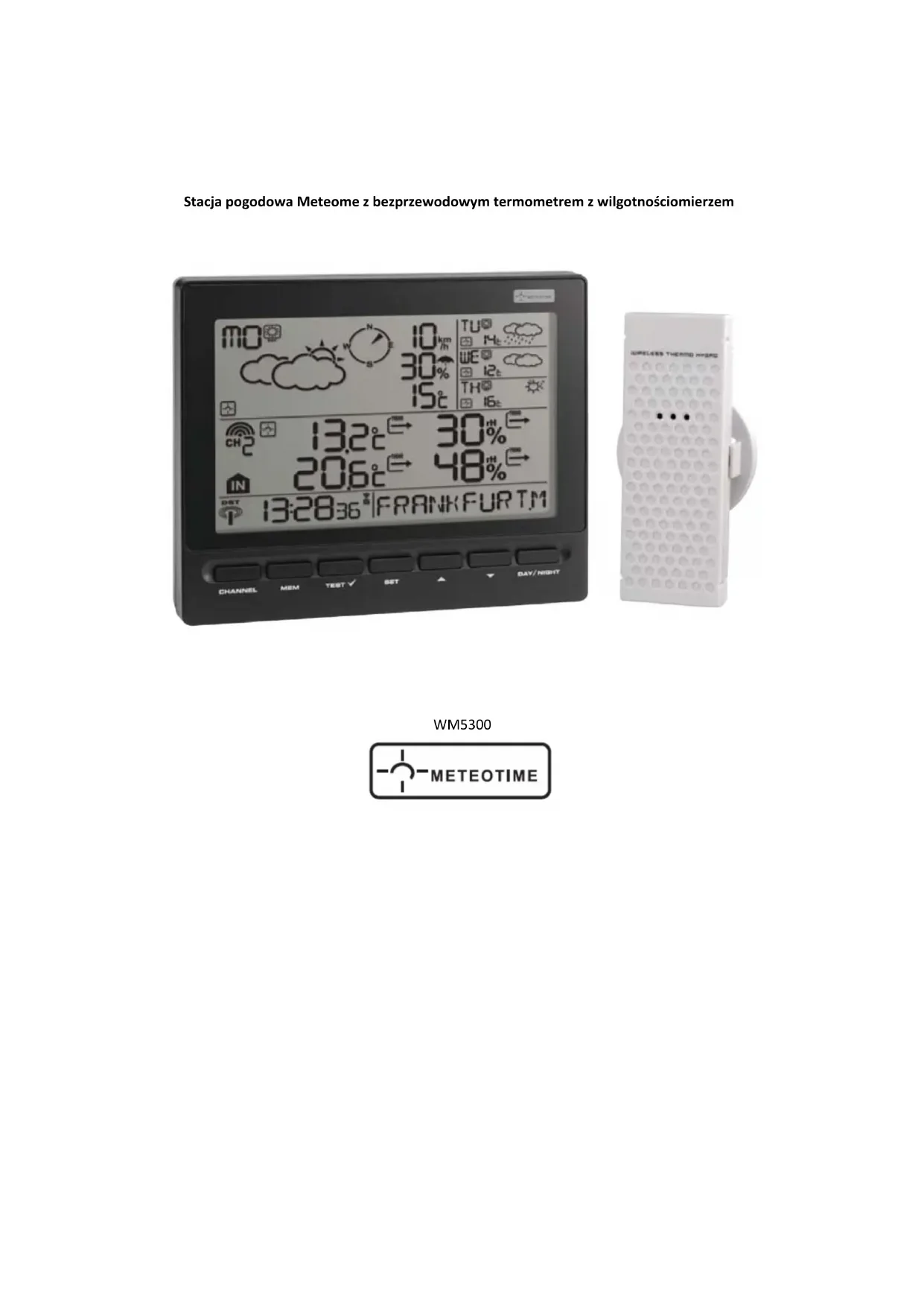 Stacja pogodowa Meteotime różni się od tradycyjnych stacji pogodowych, które mierzą tylko panujące warunki. Dane tej stacji pogodowej są oparte na systemie METEOTIME, aktualizowanym codziennie przez wykwalifikowanych zawodowych meteorologów pracujących na najnowocześniejszych przyrządach. Stacja pogodowa Meteotime została skonstruowana tak, że może odbierać zakodowany sygnał METEOTIME zawierający informacje o pogodzie. Informacje są przesyłane przez stacje zegarów sterowanych radiowo DCF77 (znajdujące się w Niemczech). Z tego powodu stacja pogodowa Meteotime jest również zegarem sterowanym radiowo z jego wszystkimi znanymi zaletami, takimi jak pokazywanie zawsze dokładnego czasu, automatyczna zmiana czasu letniego w zimie i latem. Stacja daje możliwość odbioru prognozy pogody dla 60 regionów meteorologicznych w Europie do 4 dni wcześniej i zapewnia prognozę z 2-dniowym wyprzedzeniem dla 30 kolejnych regionów. JAK UZYSKAĆ DOBRY ODBIÓR? Należy przeczytać broszurę „Osobiste Centrum Meteorologiczne PMC - ważne”. Obserwować symbol DOBRY ODBIÓR lub ZŁY ODBIÓR na wyświetlaczu. Po znalezieniu właściwego miejsca dla DOBREGO ODBIORU można zostawić tam stację pogodową Meteotime, która zbierze dane za pomocą sygnału sterowanego radiowo. W ciągu kilku minut pojawi się czas i data. Jednak przesyłanie bardzo dużej ilości danych (prognoza dla wszystkich regionów i dni) zajmie znacznie więcej czasu. Otrzymanie wszystkich danych w całości zajmie do 24 godzin od momentu pierwszej konfiguracji.WŁAŚCIWOŚCI W tym zestawie znajduje się główna jednostka, czyli stacja pogodowa Meteotime oraz zdalny czujnik zewnętrzny termometru z wilgotnościomierzem. Stacja pogodowa Meteotime posiada czujnik termometru z wilgotnościomierzem do mierzenia temperatury wilgotności wewnątrz, a także bezprzewodowy zewnętrzny czujnik termometru z wilgotnościomierzem do mierzenia temperatury i wilgotności na zewnątrz. Główne cechy: