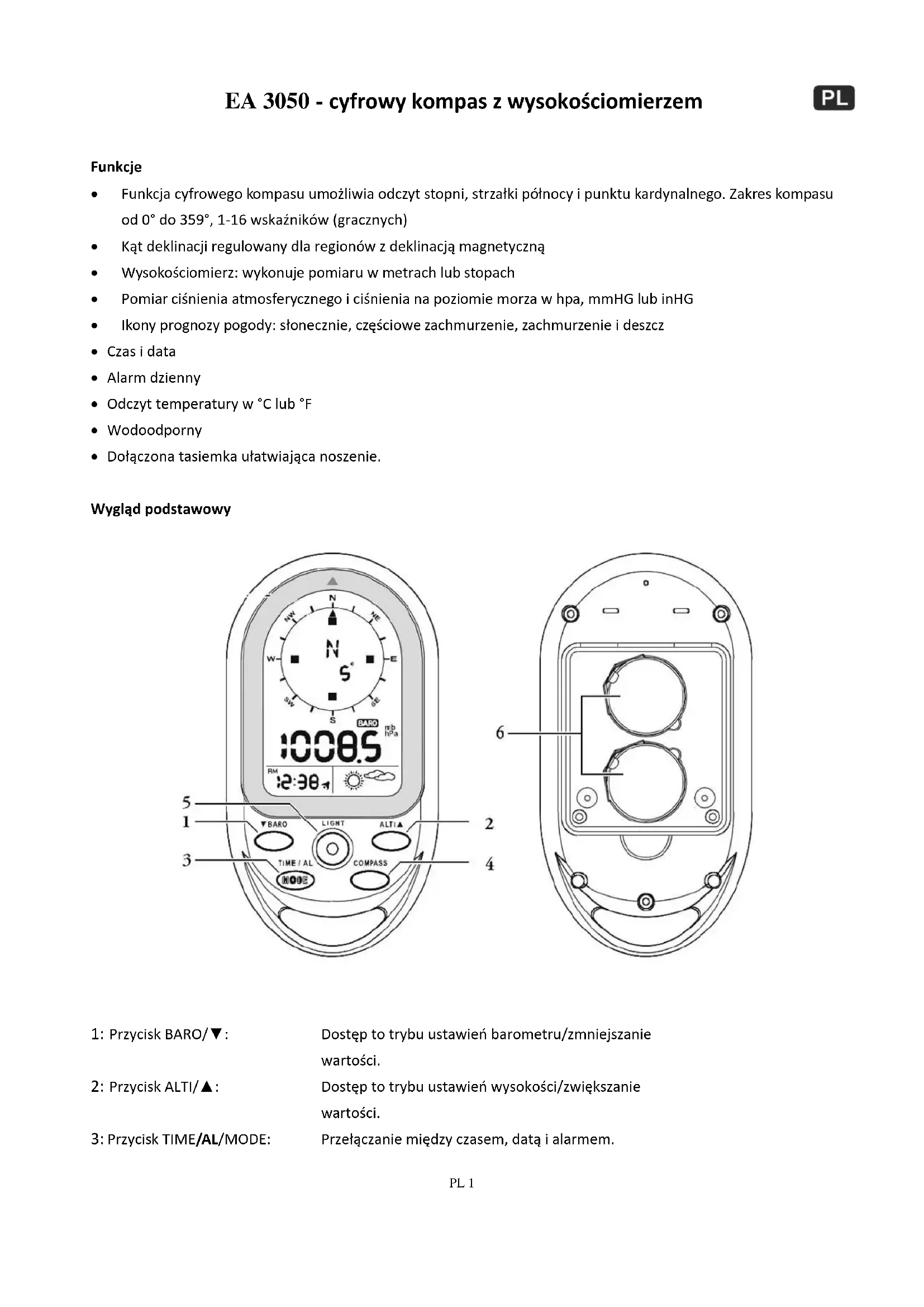 1: Przycisk BARO/▼: Dostęp to trybu ustawień barometru/zmniejszanie wartości. 2: Przycisk ALTI/▲: Dostęp to trybu ustawień wysokości/zwiększanie wartości. 3: Przycisk TIME/AL/MODE: Przełączanie między czasem, datą i alarmem.PL 2 Dostęp do trybu ustawień czasu/alarmu. 4: Przycisk COMPASS: Dostęp do trybu ustawień kompasu; Wyjście z każdego trybu ustawień. 5: Przycisk LIGHT/BLOKADA: włączanie podświetlenia; przyciski blokowania/odblokowania. 6: KOMORY BATERII