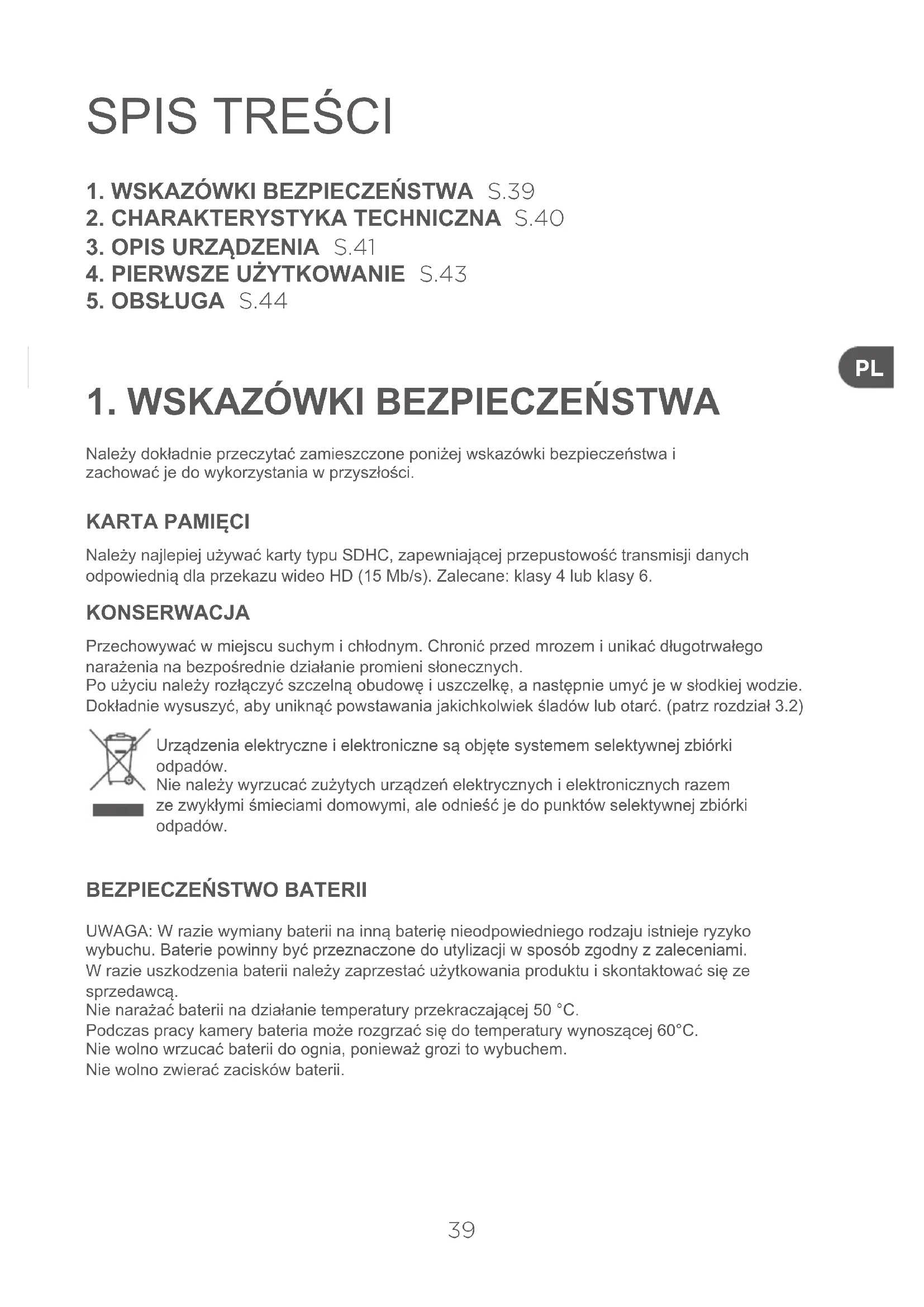 Należy najlepiej używać karty typu SDHC, zapewniającej przepustowość transmisji danych odpowiednią dla przekazu wideo HD (15 Mb/s). Zalecane: klasy 4 lub klasy 6. KONSERWACJA Przechowywać w miejscu suchym i chłodnym. Chronić przed mrozem i unikać długotrwałego narażenia na bezpośrednie działanie promieni słonecznych. Po użyciu należy rozłączyć szczelną obudowę i uszczelkę, a następnie umyć je w słodkiej wodzie. Dokładnie wysuszyć, aby uniknąć powstawania jakichkolwiek śladów lub otarć. (patrz rozdział 3.2)Urządzenia elektryczne i elektroniczne są objęte systemem selektywnej zbiórki odpadów. Nie należy wyrzucać zużytych urządzeń elektrycznych i elektronicznych razem ze zwykłymi śmieciami domowymi, ale odnieść je do punktów selektywnej zbiórki odpadów.