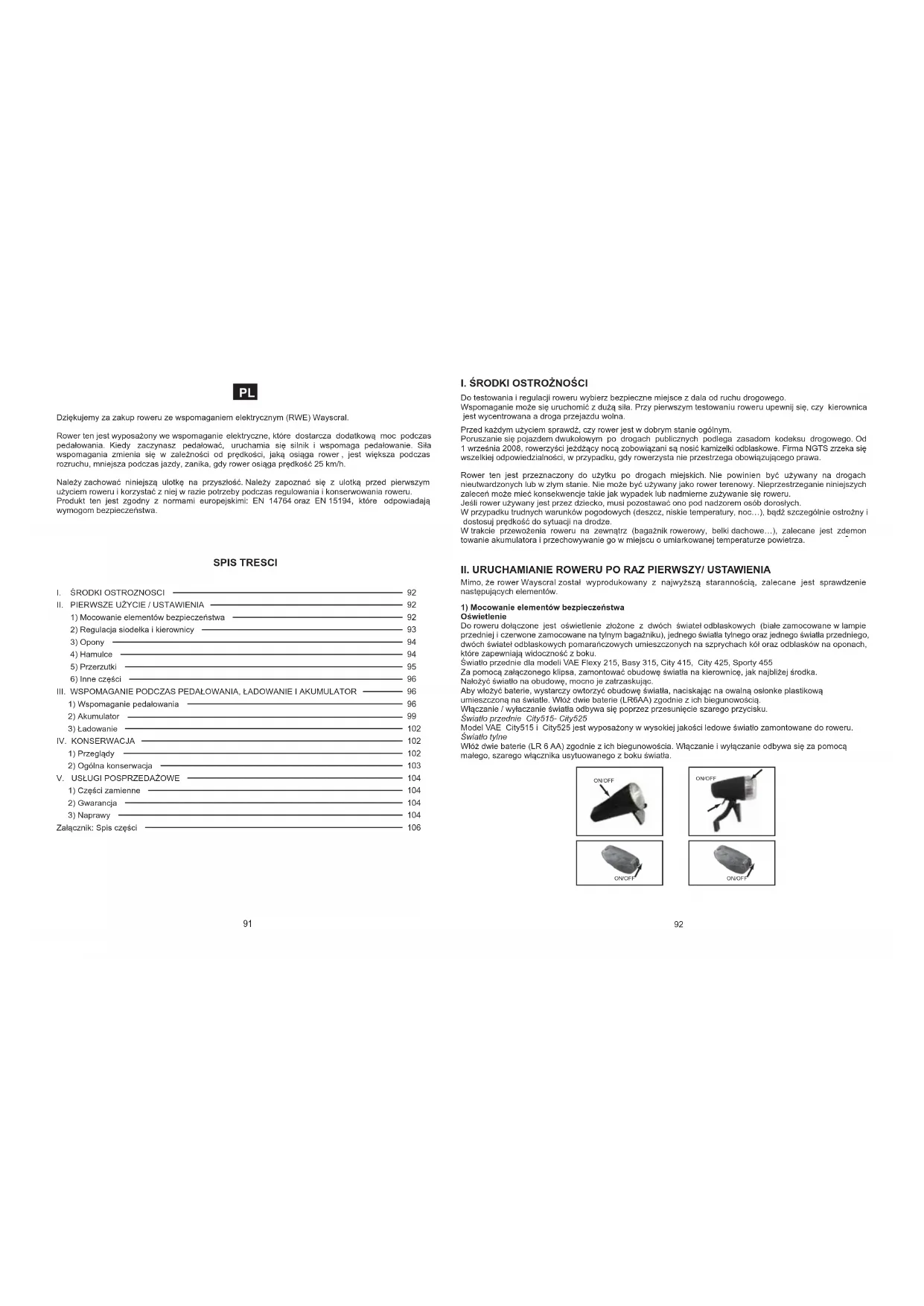Załącznik: Spis części Dziękujemy za zakup roweru ze wspomaganiem elektrycznym (RWE) Wayscral. Rower ten jest wyposażony we wspomaganie elektryczne, które dostarcza dodatkową moc podczas pedałowania. Kiedy zaczynasz pedałować, uruchamia się silnik i wspomaga pedałowanie. Siła wspomagania zmienia się w zależności od prędkości, jaką osiąga rower , jest większa podczas rozruchu, mniejsza podczas jazdy, zanika, gdy rower osiąga prędkość 25 km/h. Należy zachować niniejszą ulotkę na przyszłość. Należy zapoznać się z ulotką przed pierwszym użyciem roweru i korzystać z niej w razie potrzeby podczas regulowania i konserwowania roweru. Produkt ten jest zgodny z normami europejskimi: EN 14764 oraz EN 15194, które odpowiadają wymogom bezpieczeństwa. SPIS TRESCI