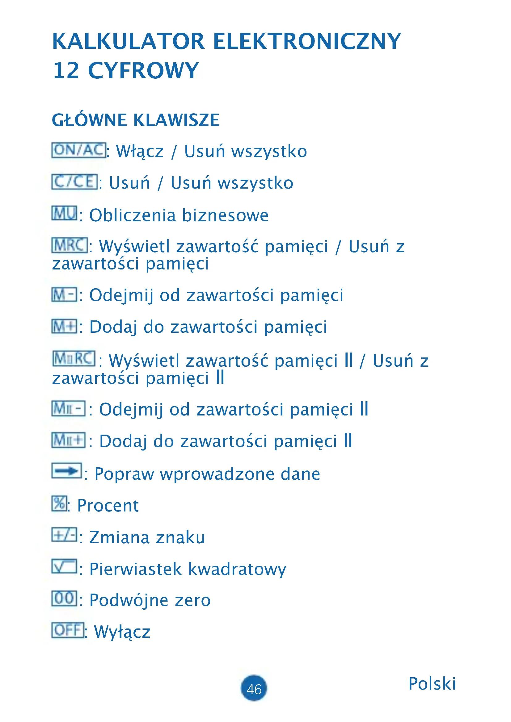 : Odejmij od zawartości pamięci II : Dodaj do zawartości pamięci II : Popraw wprowadzone dane : Procent : Zmiana znaku : Pierwiastek kwadratowy : Podwójne zero : Wyłącz Polski47 FUNKCJE PRZEŁĄCZNIKÓW:
