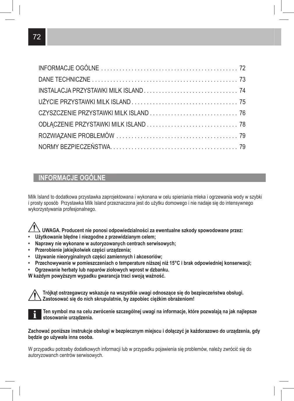 UWAGA: przystawka zęszy przechowodzyc oczyszczenie dzbanka i innych czymi. Upewnić są czy poszȩgólne elementy zostaly poprawnie zastalowane. Scionki dzbanka moga osiąac wysockie temperatury: niedzepieczenia poparzeń! Uzywac przystawka Milk Island jedynie do wody i mleka. jest zabronione stosowanie jej z plnych innych typów i o innym składzie chemiznym.