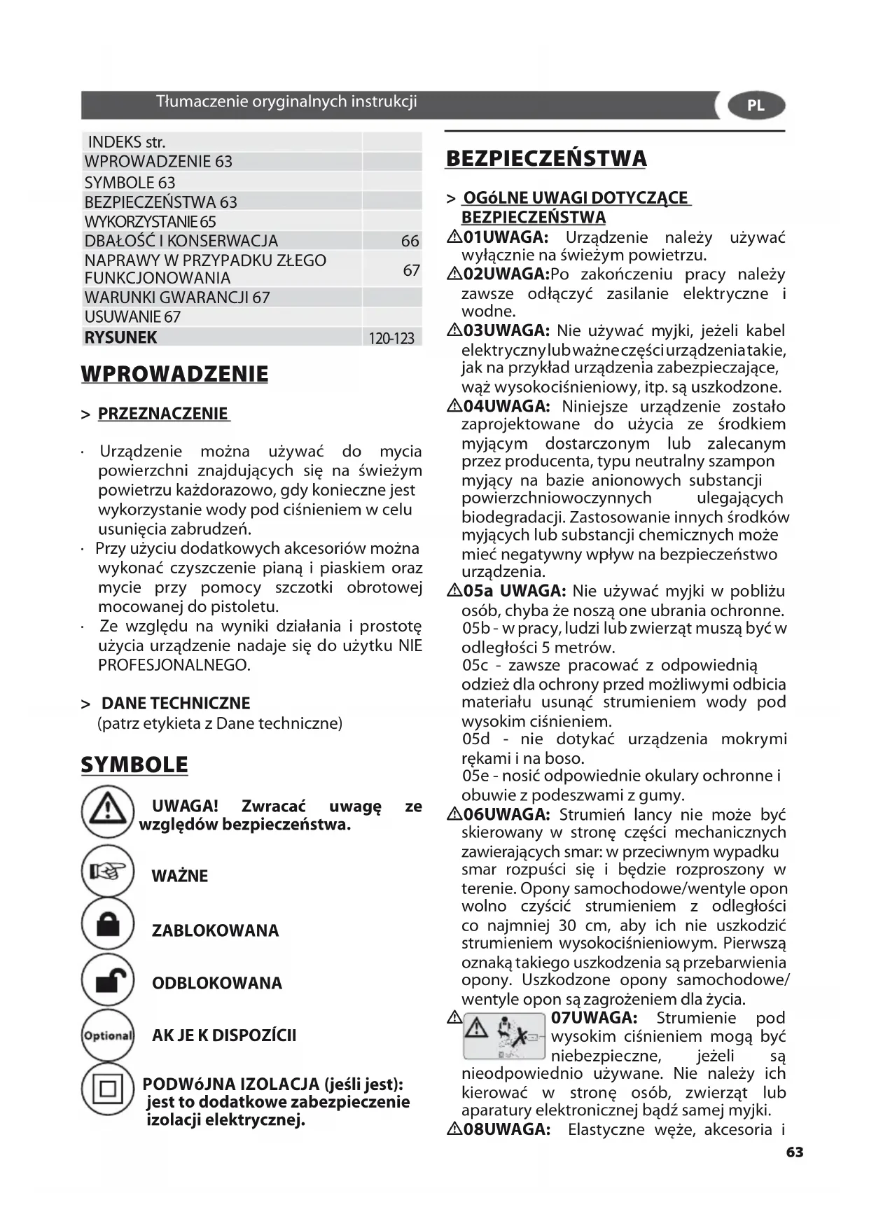PODWóJNA IZOLACJA (jeśli jest): jest to dodatkowe zabezpieczenie izolacji elektrycznej. bEzpIECzEŃSTwA > OGóLNE UWAGI DOTYCZĄCE BEZPIECZEŃSTWA