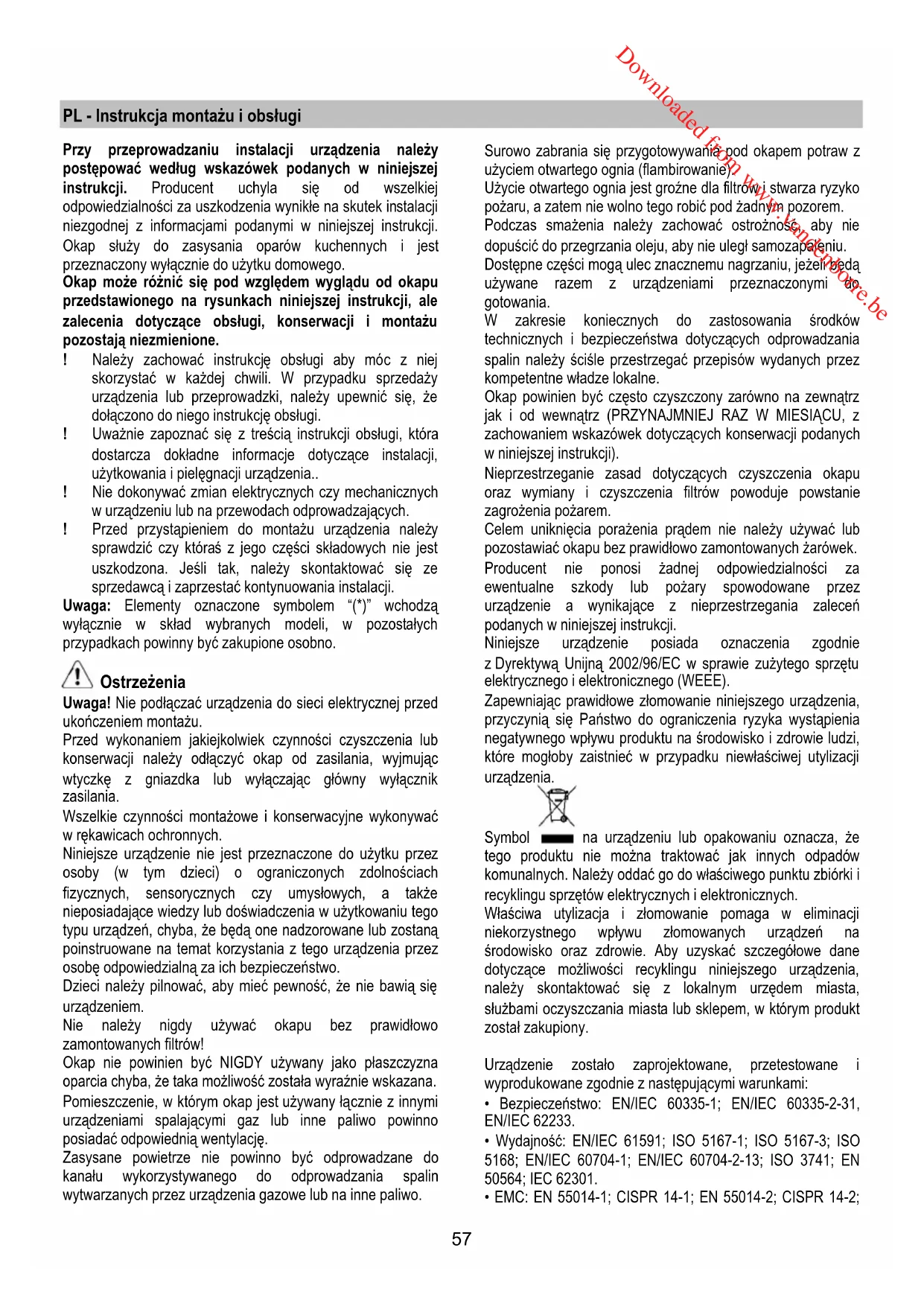 - EMC: EN 55014-1; CISPR 14-1; EN 55014-2; CISPR 14-2; Downloaded from www.vandenborre.be58 EN/IEC 61000-3-2; EN/IEC 61000-3-3. Sugestie dotyczące prawidłowego użytkowania w celu zmniejszenia wpływu na środowisko: Włączyć okap na minimalne obroty w momencie rozpoczęcia gotowania i zostawić go włączony przez kilka minut po zakończeniu gotowania. Zwiększać obroty jedynie w przypadku dużej ilości dymu i pary oraz używać wysokich obrotów tylko w ekstremalnych sytuacjach. W razie potrzeby wymienić filtr/filtry węglowe, aby utrzymać dobrą skuteczność redukcji zapachów. W razie konieczności wyczyścić filtr/filtry smaru, aby utrzymać dobrą wydajność filtra smaru. Używać maksymalnej średnicy systemu wentylacyjnego wskazanej w niniejszej instrukcji, w celu optymalizacji wydajności i minimalizacji hałasu. UWAGA! Nie dokręcenie śrub oraz urządzeń mocujących zgodnie z niniejszymi instrukcjami może spowodować zagrożenia natury elektrycznej. Obsługa Urządzenie można używać jako wyciąg (odprowadzanie oparów na zewnątrz) bądź jako pochłaniacz (opary są filtrowane i odprowadzane z powrotem do pomieszczenia). Okap pracujący jako wyciąg Opary są usuwane na zewnątrz rurą odprowadzającą zamocowaną do kołnierza łączeniowego. Średnica rury odprowadzającej musi być równa średnicy kołnierza łączeniowego. Uwaga! Rura odprowadzająca nie jest dostarczona w komplecie z urządzeniem i należy ją zakupić. W części poziomej, rura musi mieć lekką inklinację do góry (około 10°), tak aby ułatwić przepływ powietrza na zewnątrz. Jeśli okap jest zaopatrzony w filtry węglowe, to muszą one zostać zdjęte. Podłączyć okap do przewodu wentylacyjnego rurą odprowadzającą o średnicy odpowiadającej rozmiarowi wylotu z okapu (kołnierz łączeniowy). Użycie przewodów o mniejszym przekroju powoduje zmniejszenie zdolności zasysania oraz drastyczne zwiększenie hałaśliwości okapu. Producent, zatem, nie ponosi żadnej odpowiedzialności za ten stan. ! Używać jak najkrótszego przewodu. ! Używać przewodu o jak najmniejszej liczbie zagięć (maksymalny kąt zagięcia: 90°). ! Unikać radykalnych zmian przekroju przewodu. ! Używać przewodu o jak najgładszej powierzchni wewnętrznej. ! Materiał przewodu musi być zgodny z obowiązującymi normami. Okap pracujący jako pochłaniacz Aby używać okapu w tej wersji należy zainstalować filtr węglowy. Można go kupić u sprzedawcy. Zasysane powietrze jest oczyszczane z tłuszczu i zapachów zanim zostanie zwrócone do pomieszczenia przez kratki w górnej osłonie komina. Instalacja okapu Minimalna odległość między powierzchnią, na której znajdują się naczynia na urządzeniu grzejnym a najniższą częścią okapu kuchennego powinna wynosić nie mniej niż 50cm w przypadku kuchenek elektrycznych i nie mniej niż 65cm w przypadku kuchenek gazowych lub typu mieszanego. Jeżeli w instrukcji zainstalowania kuchni gazowej podana jest większa odległość, należy dostosować się do takich wskazań. Podłączenie elektryczne Napięcie sieciowe musi odpowiadać napięciu wskazanemu na tabliczce umieszczonej w wewnętrznej części okapu. Jeśli okap jest wyposażony we wtyczkę, należy ją podłączyć do gniazdka zgodnego z obowiązującymi normami i umieszczonego w łatwo dostępnym miejscu, również po zakończonej instalacji. Jeśli okap nie jest wyposażony we wtyczkę (bezpośrednie podłączenie do sieci) lub wtyczka nie znajduje się w łatwo dostępnym miejscu, również po zakończonej instalacji, należy zastosować znormalizowany wyłącznik dwubiegunowy, który umożliwi całkowite odcięcie od sieci elektrycznej w warunkach nadprądowych kategorii III, zgodnie z zasadami instalacji. Uwaga! Przed ponownym podłączeniem obwodu okapu do zasilania i sprawdzeniem poprawności jego działania należy się zawsze upewnić, czy przewód zasilający jest prawidł owo zamontowany. Okap jest wyposażony w specjalny przewód zasilający. W razie uszkodzenia tego przewodu, należy go zamówić w biurze obsługi serwisowej. Instalacja okapu Przed przystąpieniem do instalacji: